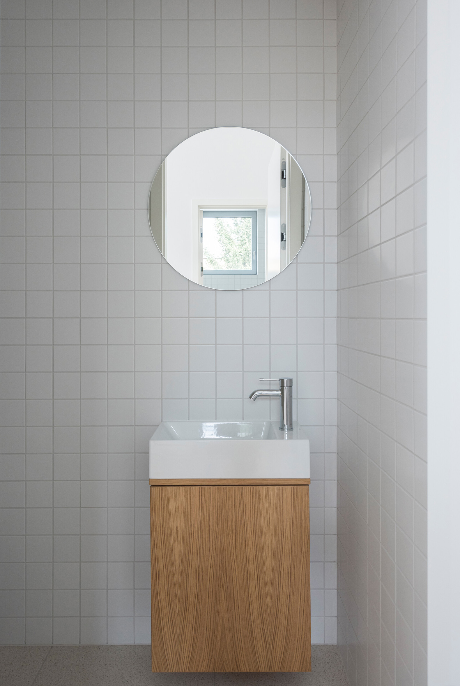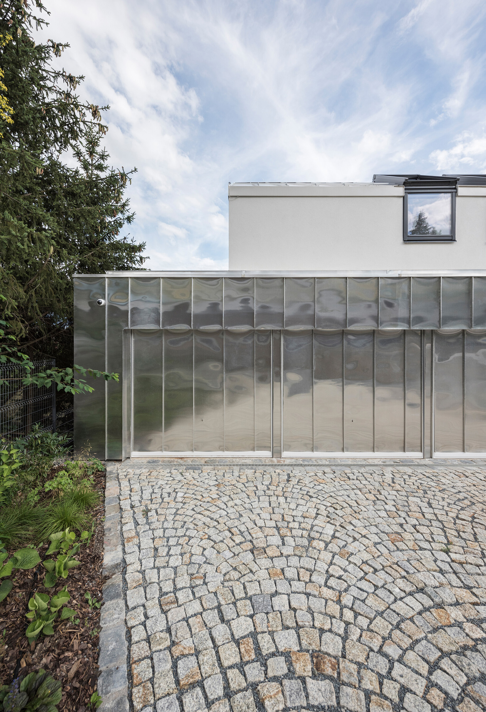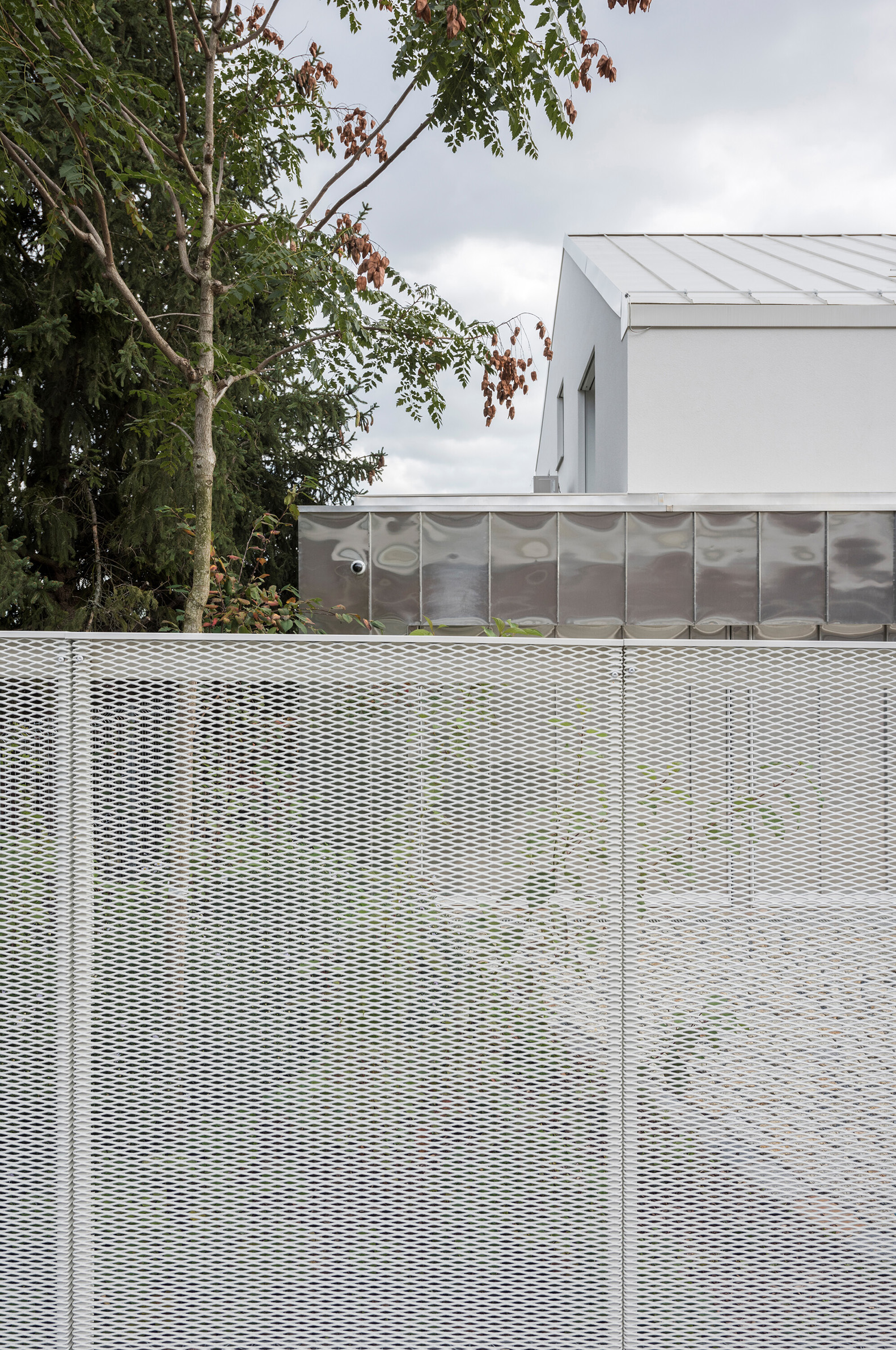 The resulting semi-detached house is characterized by south-facing terraces that allow for the planting of taller greenery around its perimeter. The mass is designed as a receding white block that follows the terrain. It is perforated by various types of square windows on the side facades composed according to views from the interior. At street level, this white monolith is intersected by a horizontal garage volume clad in natural aluminum sheet metal with standing seam. The building is single-storey with a sloping roof on the street side, responding to the immediately adjacent family houses and their building line and height. Down the slope, to the south, the building gradually expands, referring to the terraced apartment buildings above it.