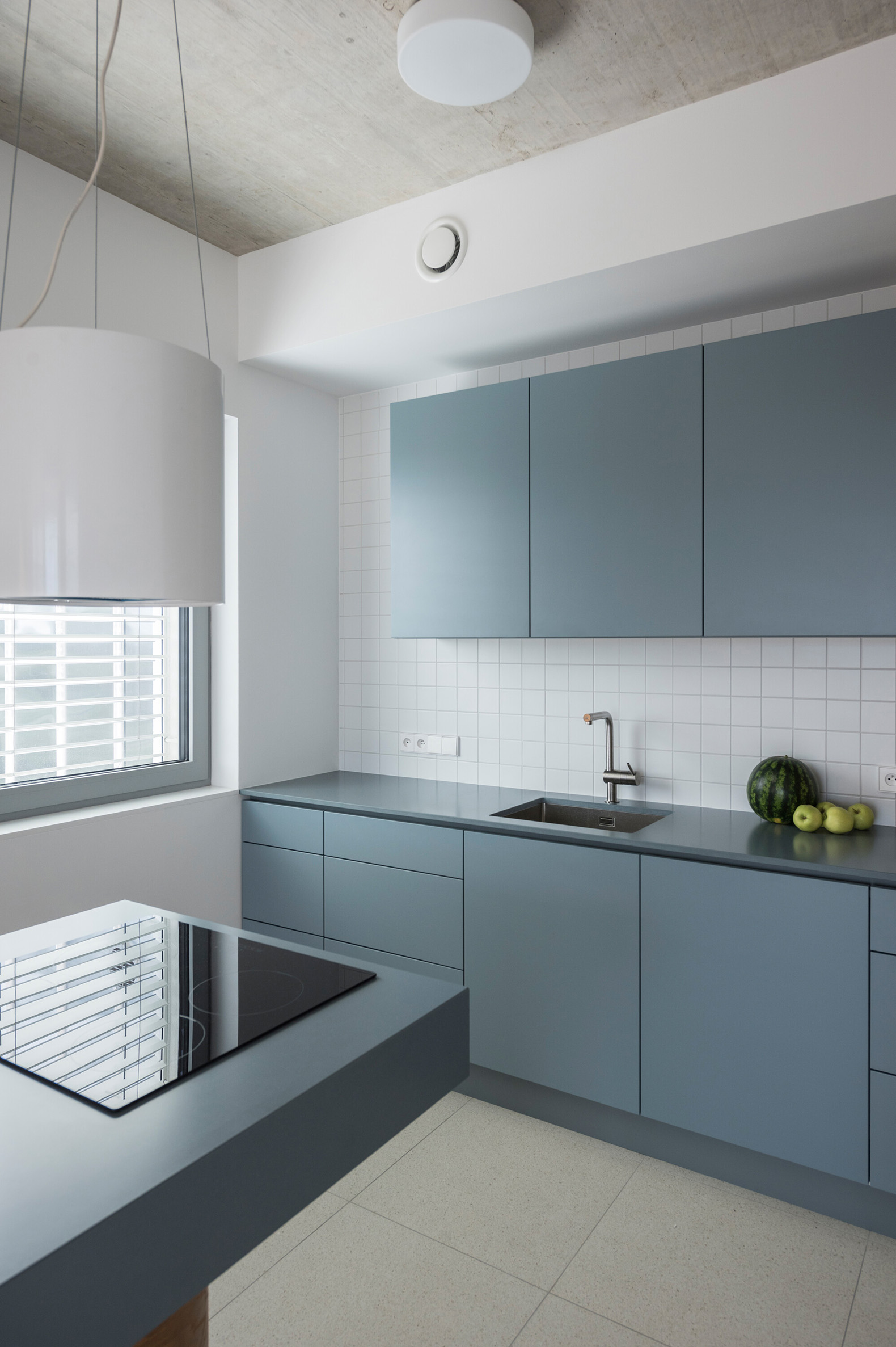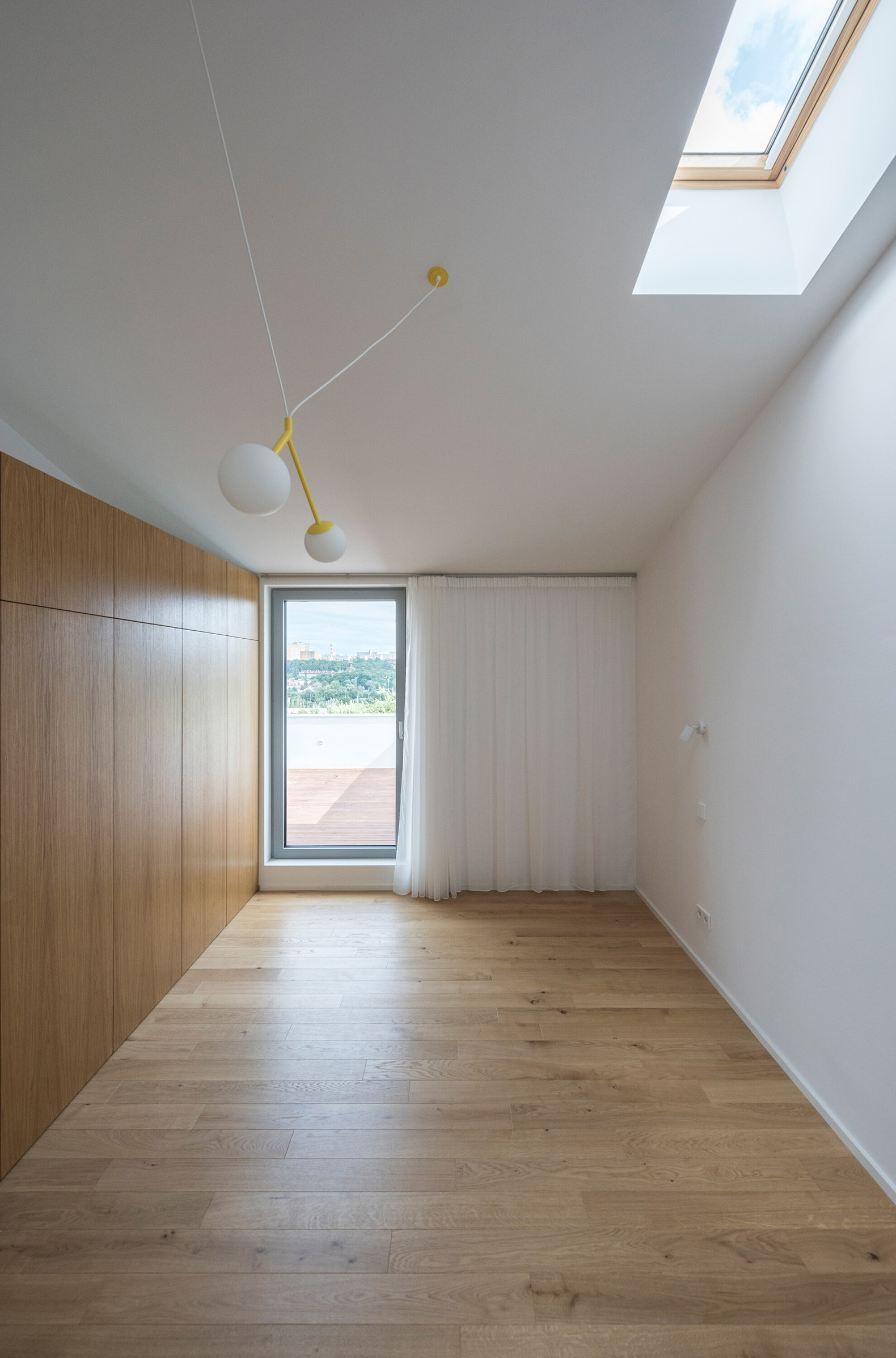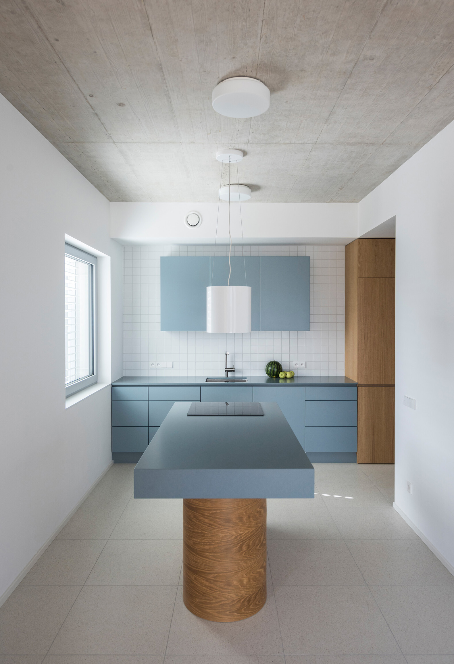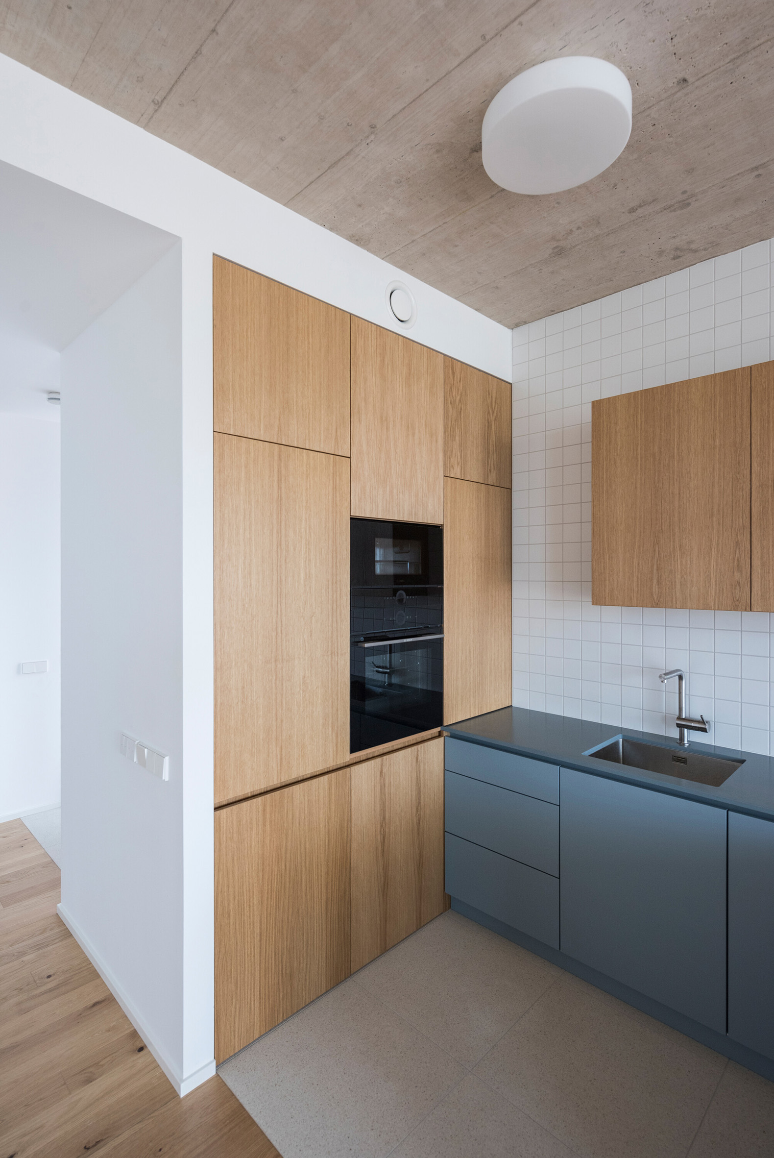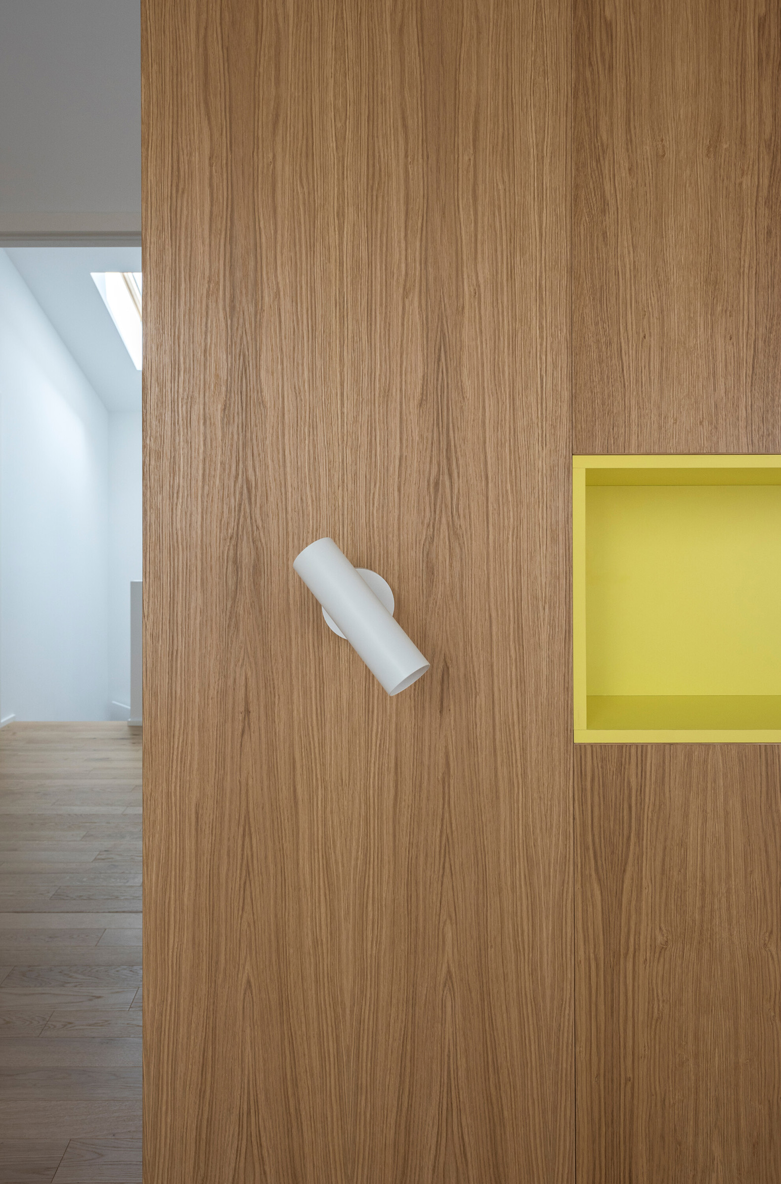 The built-in furniture brings a playful contrast to the monochromatic exterior with its use of color. Oak veneers are complemented by colorful lacquered surfaces. The terraces are shaded by pergolas with yellow canopies. In addition to access to the terraces and views of the greenery, the living rooms of all apartments also feature frameless windows with deep sills, which are also a distinctive element of the facades. The reinforced concrete of the monolithic ceiling slabs has been exposed in the living areas.