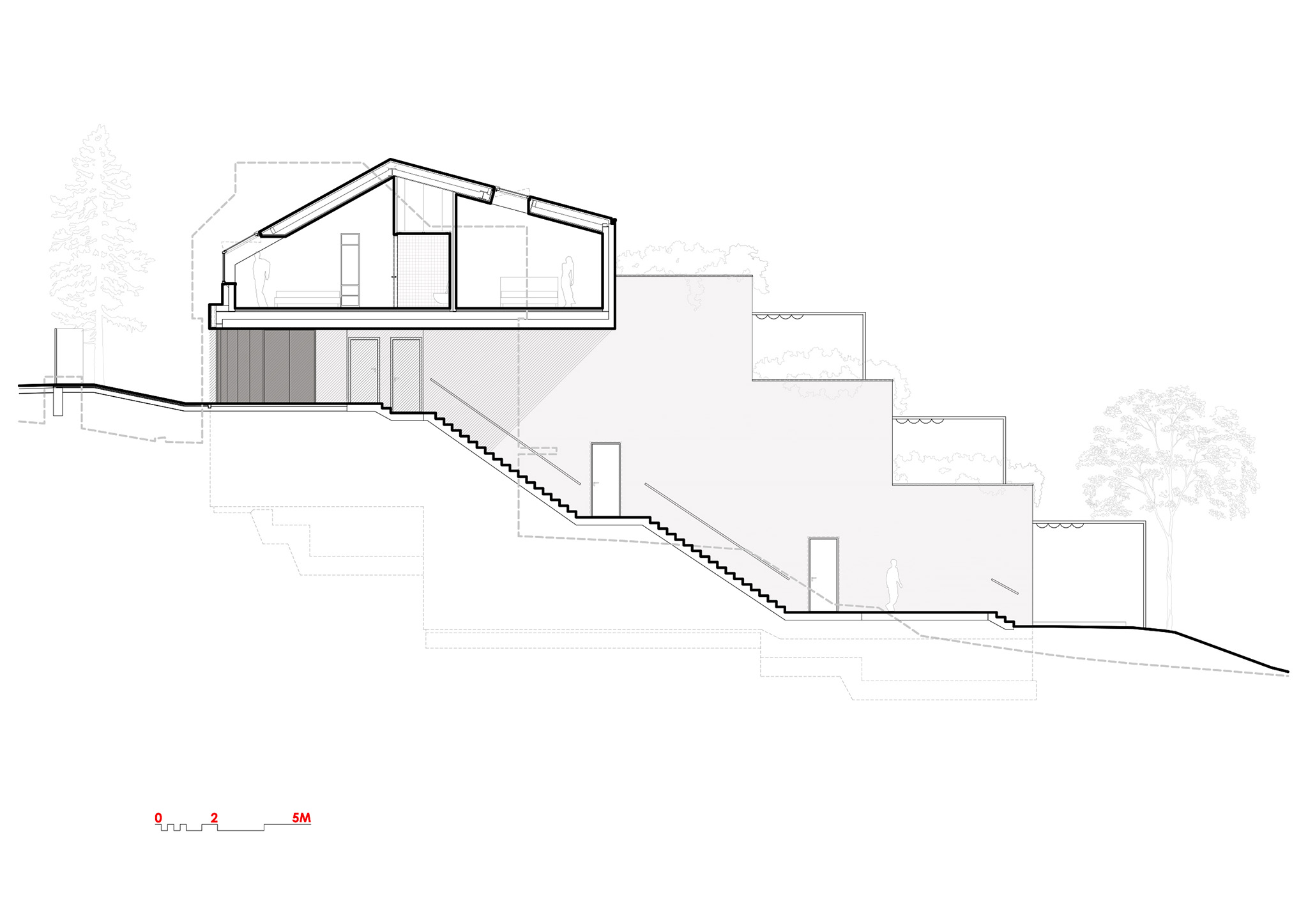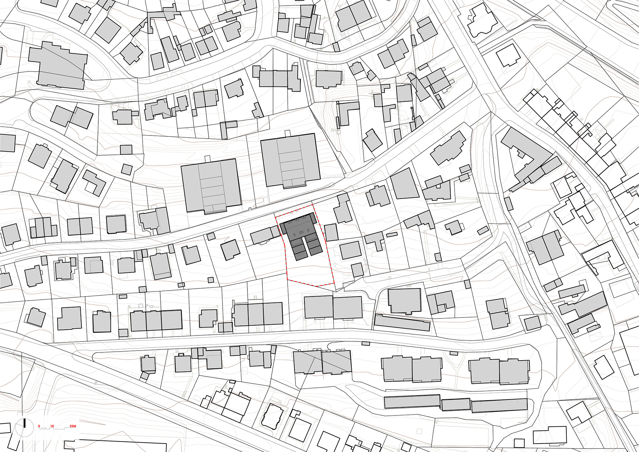 There are a number of distinctive houses in the area – perhaps the most interesting are a pair of brutalist terraced apartment buildings from the late 1960s and early 1970s, which respond to the steeply rising terrain and are located across the street from our building site. On the other hand, a group of apartment buildings from the 1970s and 1980s adjoins the southern side of the plot. We tried to reflect this architectural context in our design.
