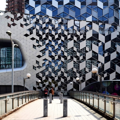 The architecture firm UNStudio have completed a building wrapped in rhomboidal shapes pattern, an original attractor for shopping, located in Putuo district in central Shanghai, China.