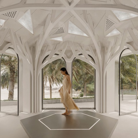In response to the local climate and architectural heritage, the project utilises main steel structures that look like tree trunks, growing around the space and stretching out a broad "canopy" covering the ceiling, to create shadows and a shelter from the sun and rain in the subtropical region. Layers of leaves on the canopy form shadowy lights under the illumination of the "sunshine", projected on the ground.
