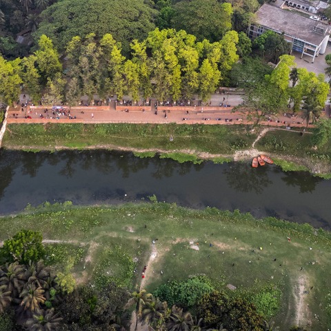 Recent urban expansion in Bangladesh has seen its originally river-facing cities become road- and land-focused, their watercourses reduced to backyards and dumping grounds. One such is Jhenaidah, where architects Khondaker Hasibul Kabir and Suhailey Farzana grew up. Keen to enhance the quality of life here, they moved back from Dhaka in 2015 and instigated a participatory initiative to enable low-income communities to build their own houses, followed by an extensive series of “Co-Creation Workshops” engaging citizens to rethink the city’s public spaces. Putting the resulting visualisations into action has produced the Urban River Spaces, which so far comprise two ghats (steps leading to waterside platforms) plus adjacent walkways and access pathways – reconnecting the city to the river. All visible surfaces are in local brick.