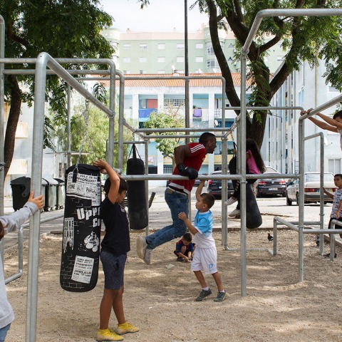 Boxing Boxes project is located between the shortage of equipment and the need for catalysts for social integration among immigrants in the Portugal Novo neighborhood, to use boxing as a tool for the exploration of body movement, the contained release of impulses, the empowerment of vulnerable social groups, and the revaluation of leisure or "unproductive" activities.