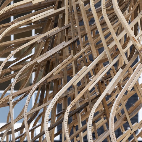 “In this project we aimed to explore how complexity can arise from simplicity. This was adopted by the variable aggregation of similar modules that are formed by scoring and steam-bending. A further ambition of the project was to diminish the need for secondary materials in the joinery system, and this decision has led us to work with lap joinery throughout the structure.”