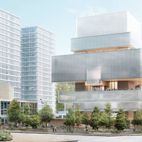 The low building densifies and activates the public realm around the new Vancouver Art Gallery by providing an active and accessible, continuous street front. The building contains entrances to the courtyard from all four surrounding streets. It also responds to the topography along West Georgia: The building’s roofline follows the slope of the street, resulting in the building which is consistently low throughout. In scale and materiality, it echoes the low wooden structures of early Vancouver, including those that framed Larwill Park until their demolition in the 1950s.