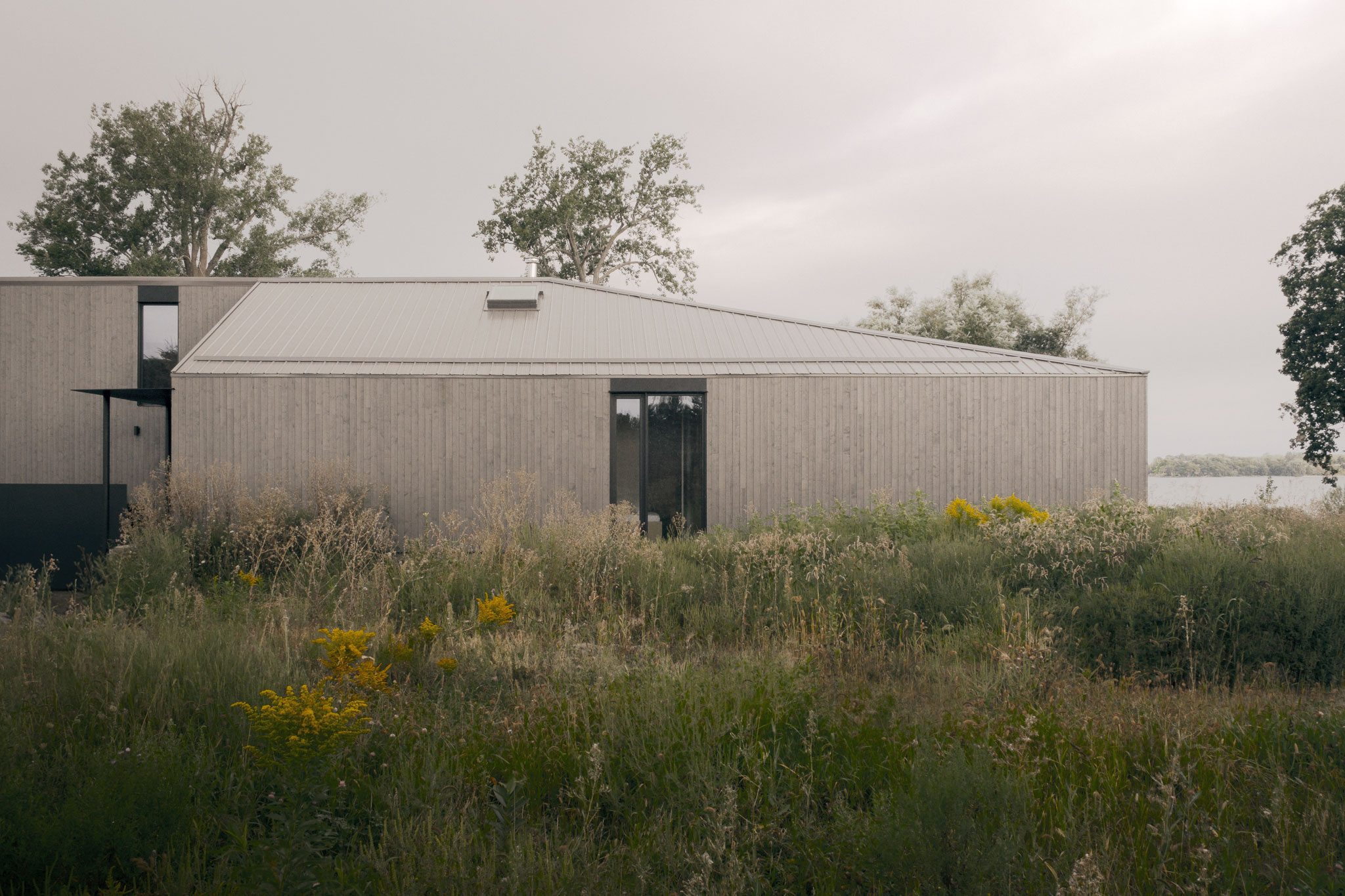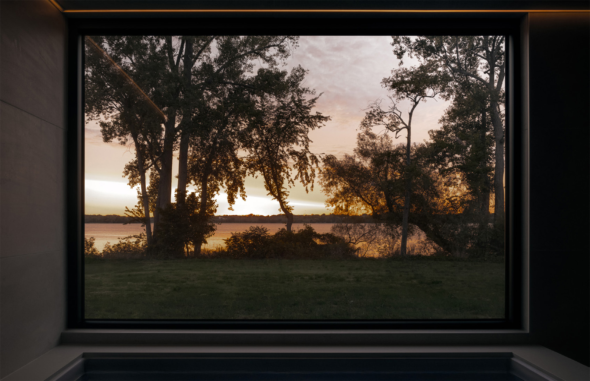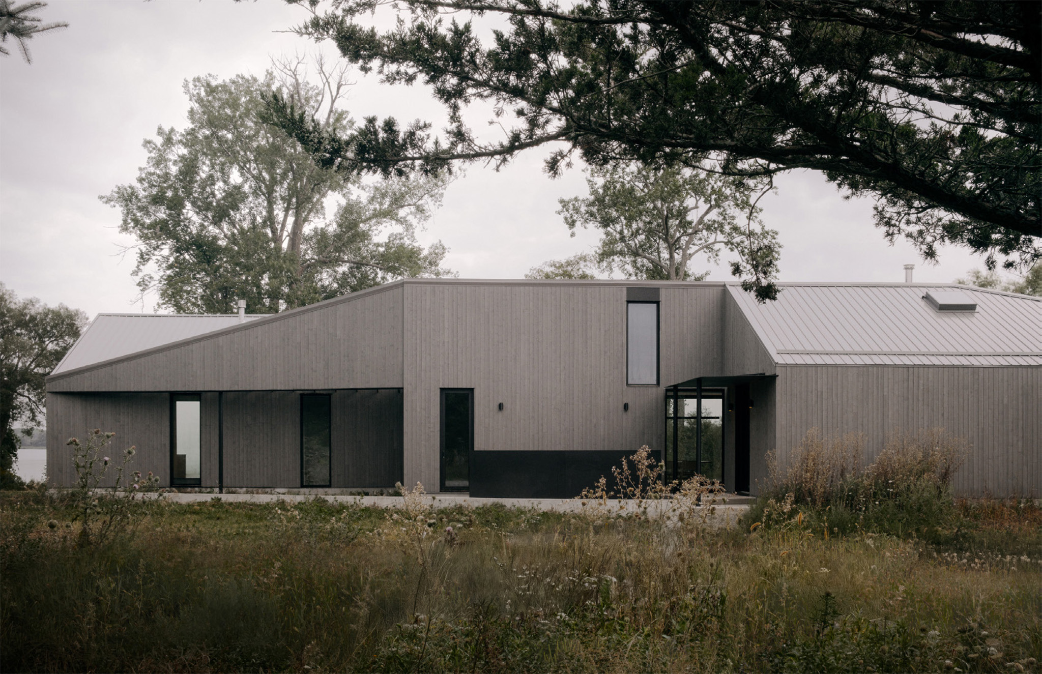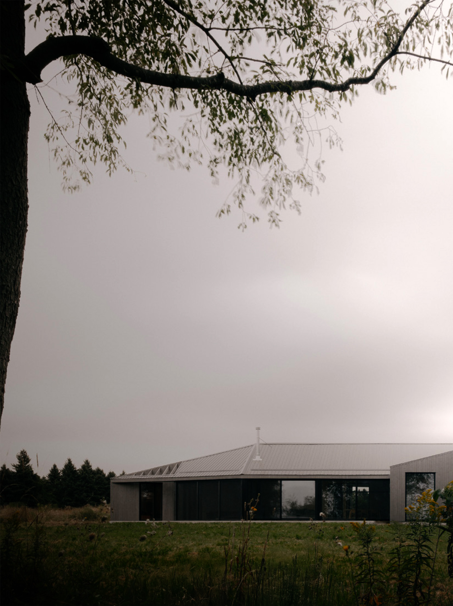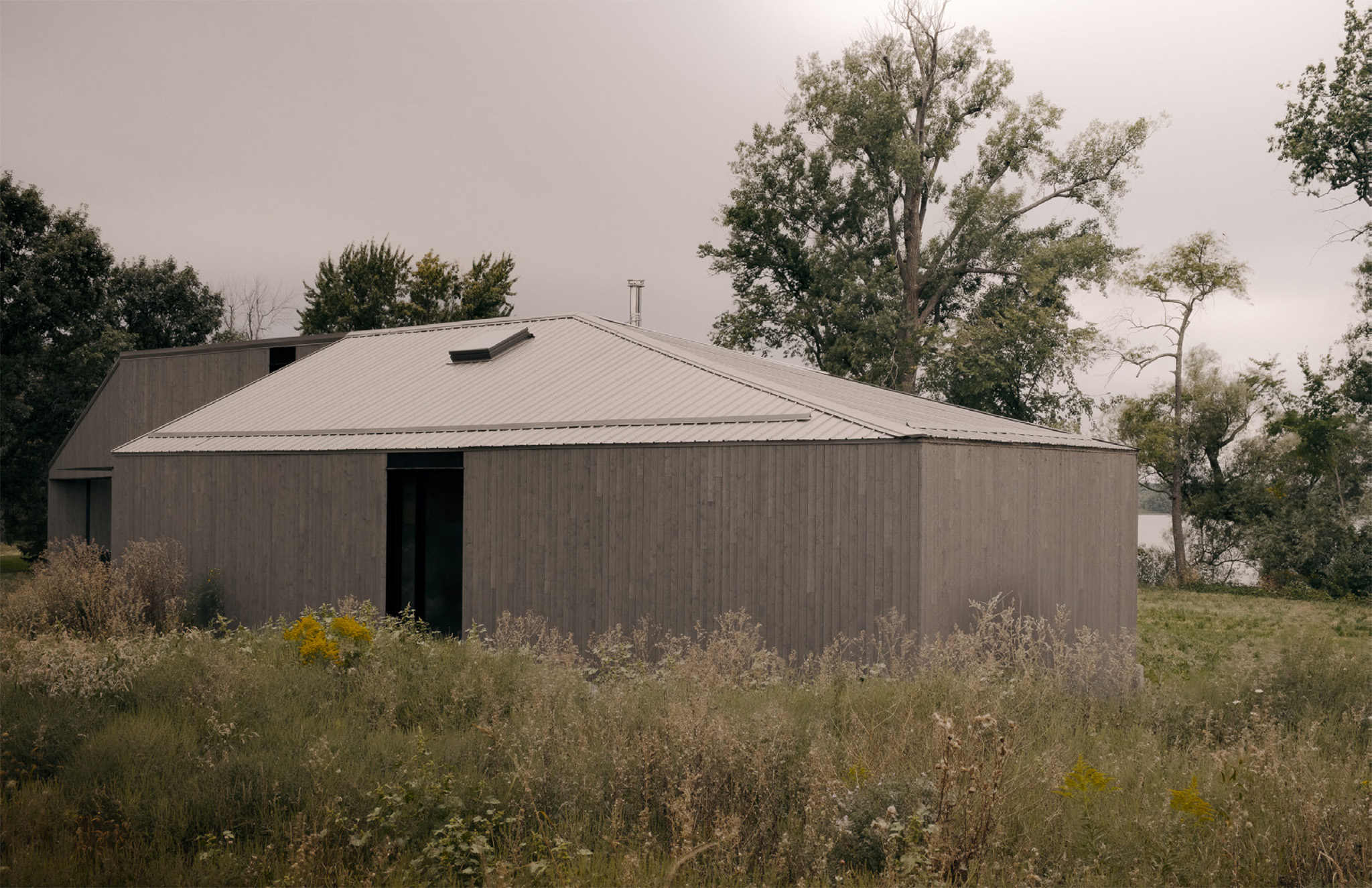 South Bay Residence is situated on a flat, rural site in Ontario, a few hours east of Toronto. Positioned on a north-facing expanse, the site offers a vast open field bordered by a delicate grove of trees and a shoreline with unique, varied trees that became integral to the architectural concept.