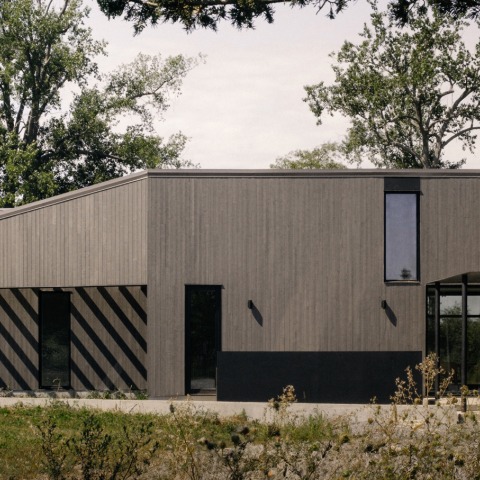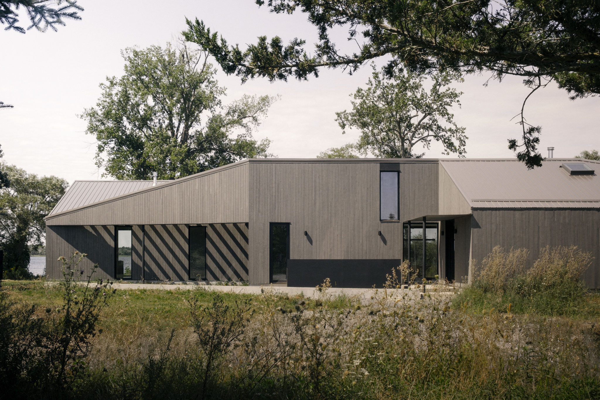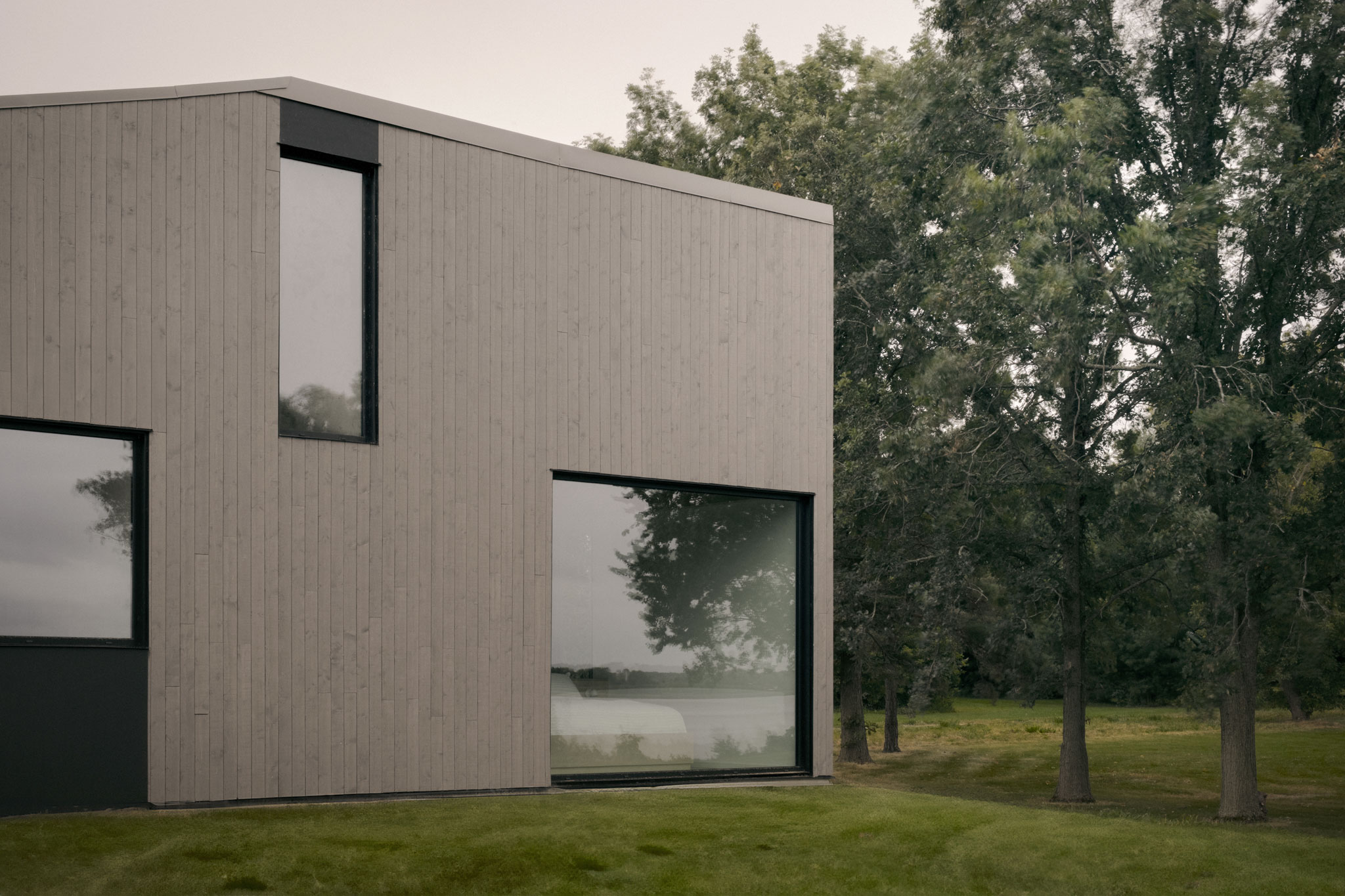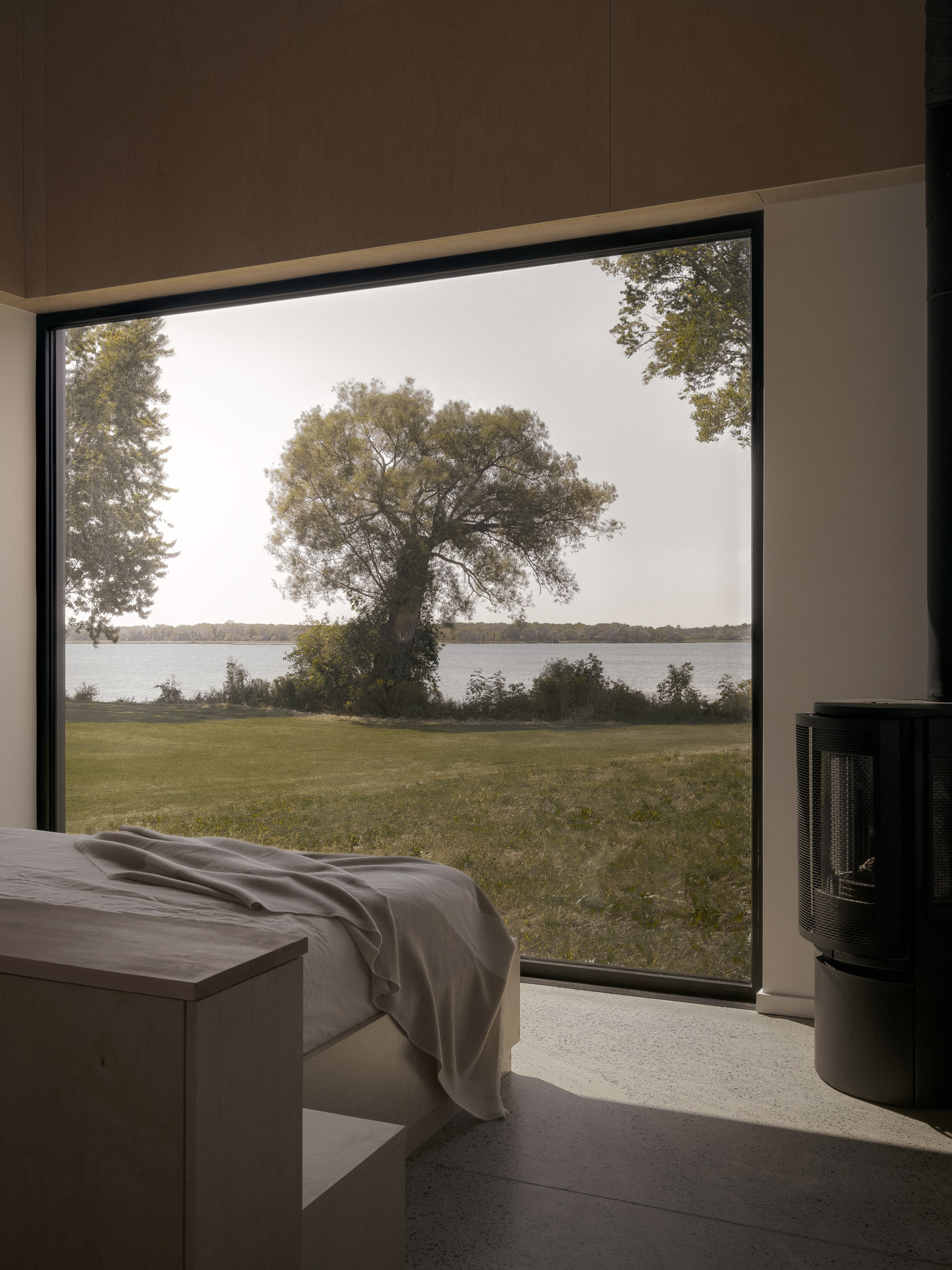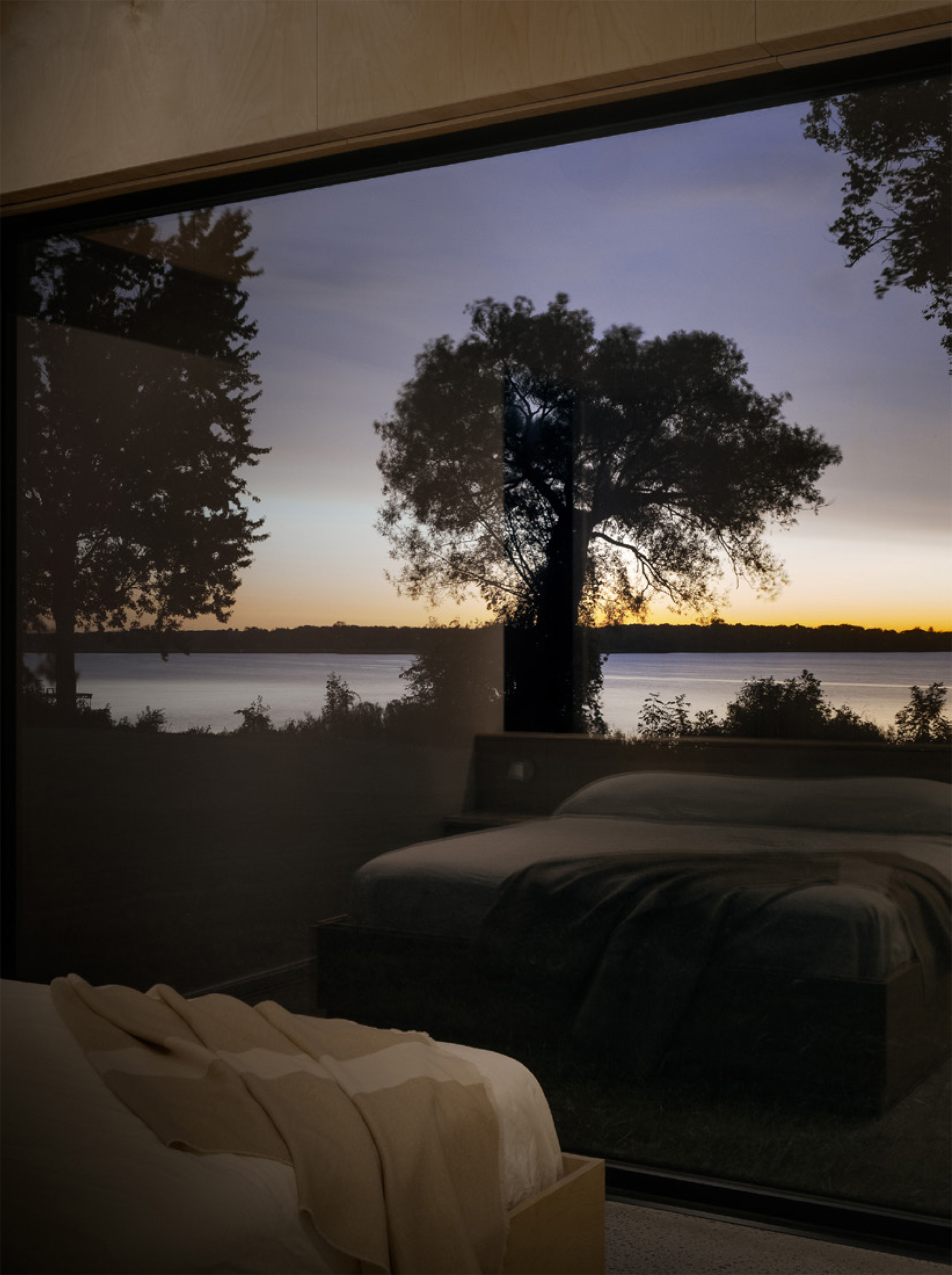 South Bay Residence is situated on a flat, rural site in Ontario, a few hours east of Toronto. Positioned on a north-facing expanse, the site offers a vast open field bordered by a delicate grove of trees and a shoreline with unique, varied trees that became integral to the architectural concept.