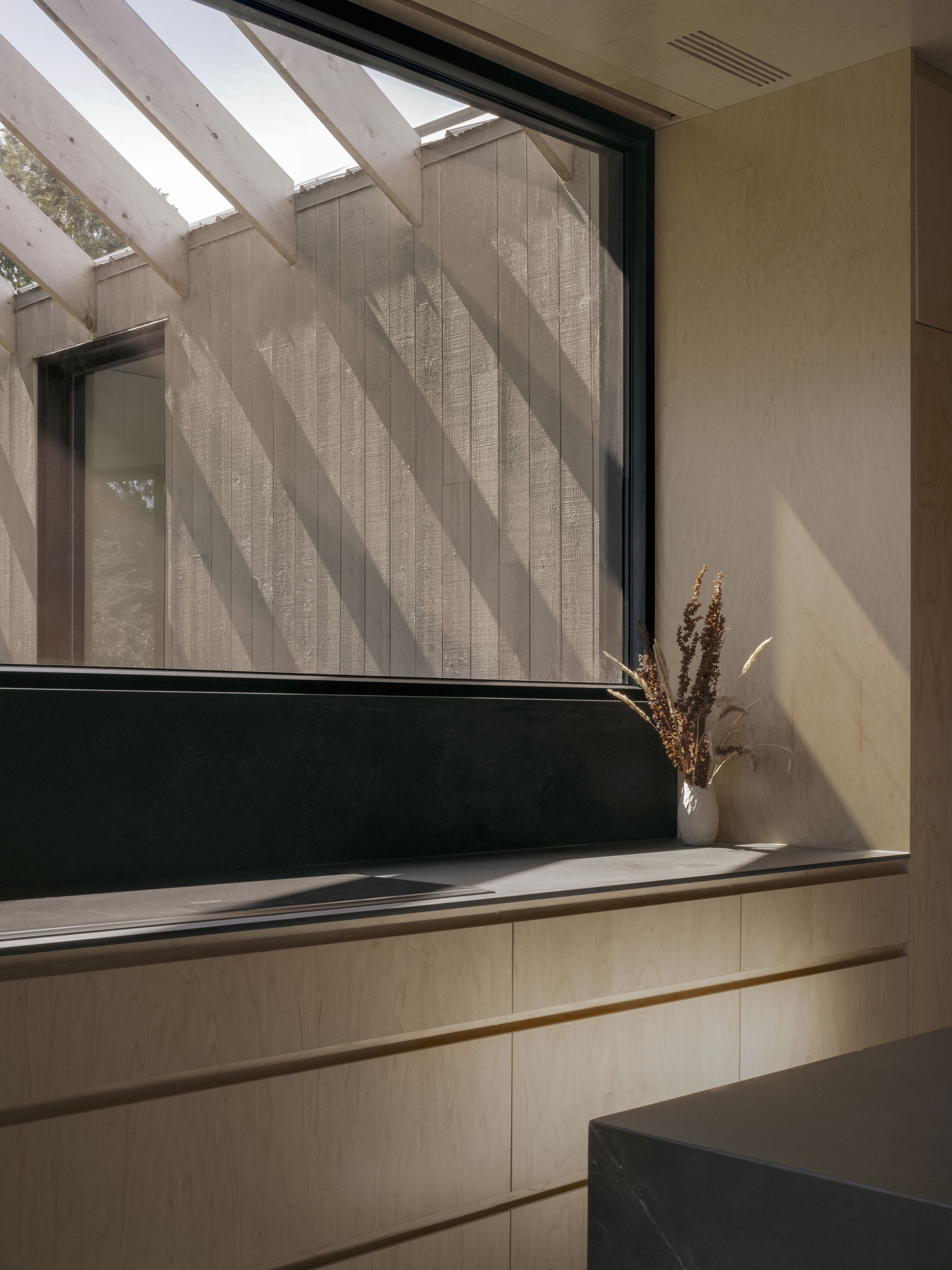 The interior palette is restrained, predominantly clad in plywood, with white walls selectively introduced below a datum aligned with the roof geometry to highlight artwork. Wet areas, including an indoor spa, are finished in contrasting tile, offering a tactile and visual distinction.