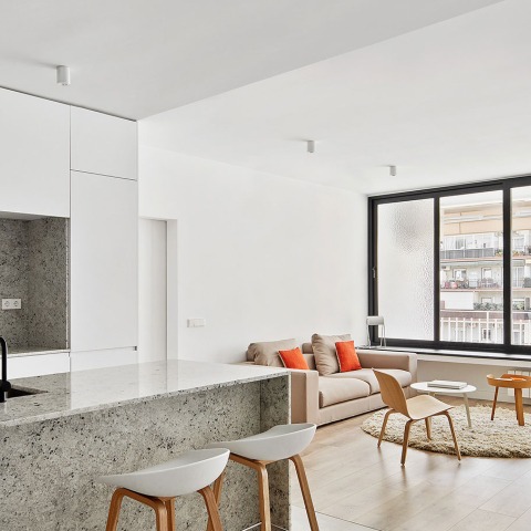 Starting from the building's construction and structural constraints in which the apartment is inserted, based on load-bearing walls with a clear and defined bay structure, the project proposes three large program blocks: a first access-related block, where the entrance, the guest bathroom (from which you access the laundry room) and the guest bedroom are located; a second block housing the master bedroom and the adjoining walk-in closet and bathroom; and a third block that is a single large space where we find the kitchen, the dining room and the living room, and which, in turn, acts as a swivel joint between the two other blocks.