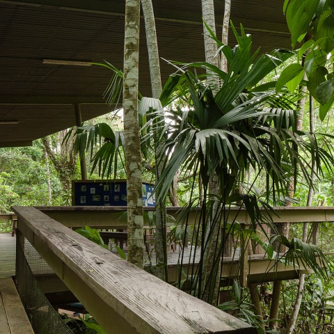 Construction of the observation tower was particularly challenging, given the requirements to avoid the removal of any trees and to build without the use of heavy equipment. Once a minute opening in the forest had been selected as the tower site, the architects and contractors devised a process whereby the main stair structural pipe was used as a lift crane, allowing the four tower platform sections to be precisely prefabricated off site, transported to the site and winched into place one at a time. Connecting columns were then cut and welded “in situ”between platforms.The observation platforms are placed at 8m intervals, with the uppermost viewing platform 32m above the forest floor, allowing views of the surrounding forest and occasional Panama Canal ship traffic to the west.