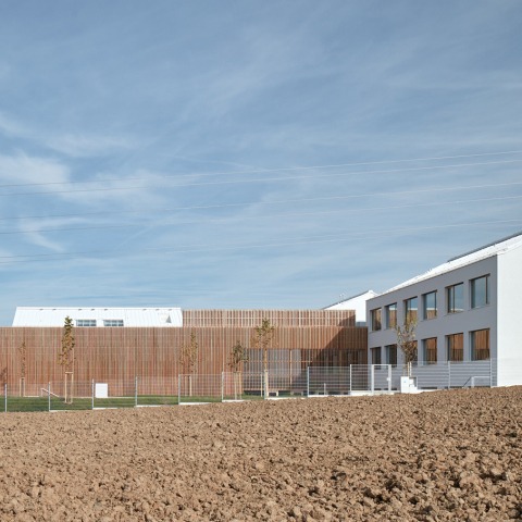 The appearance of the building towards public space is determined by four dominant two-level pitched-roof volumes with minimalistic archetypal expression inspired by rural typology accommodating classrooms and school administration. As connecting element in between there is a lower entrance structure with flat roof containing common areas such as school canteen and gymnasiums. Contrasting with the minimalistic white facade of the surrounding structures this central volume is cladded with distinctively profiled vertical larch slats also covering windows allowing for different transparency levels according to interior requirements.