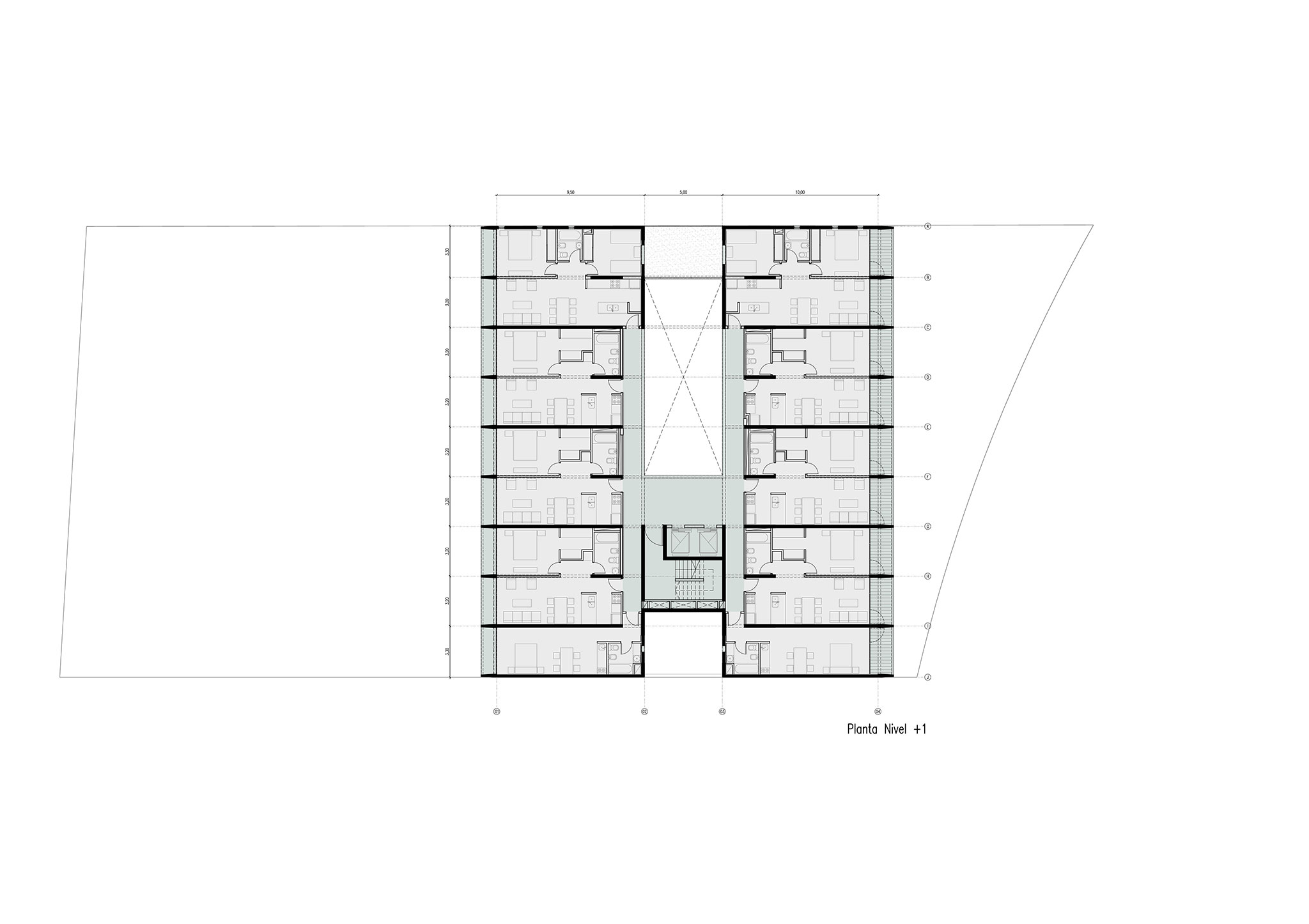 The transverse axis is materialized in a multi-story lobby and common areas that open towards Centenario Park, reinforcing the connection with the landscape and solidifying the building's role as a transitional space between city and nature.