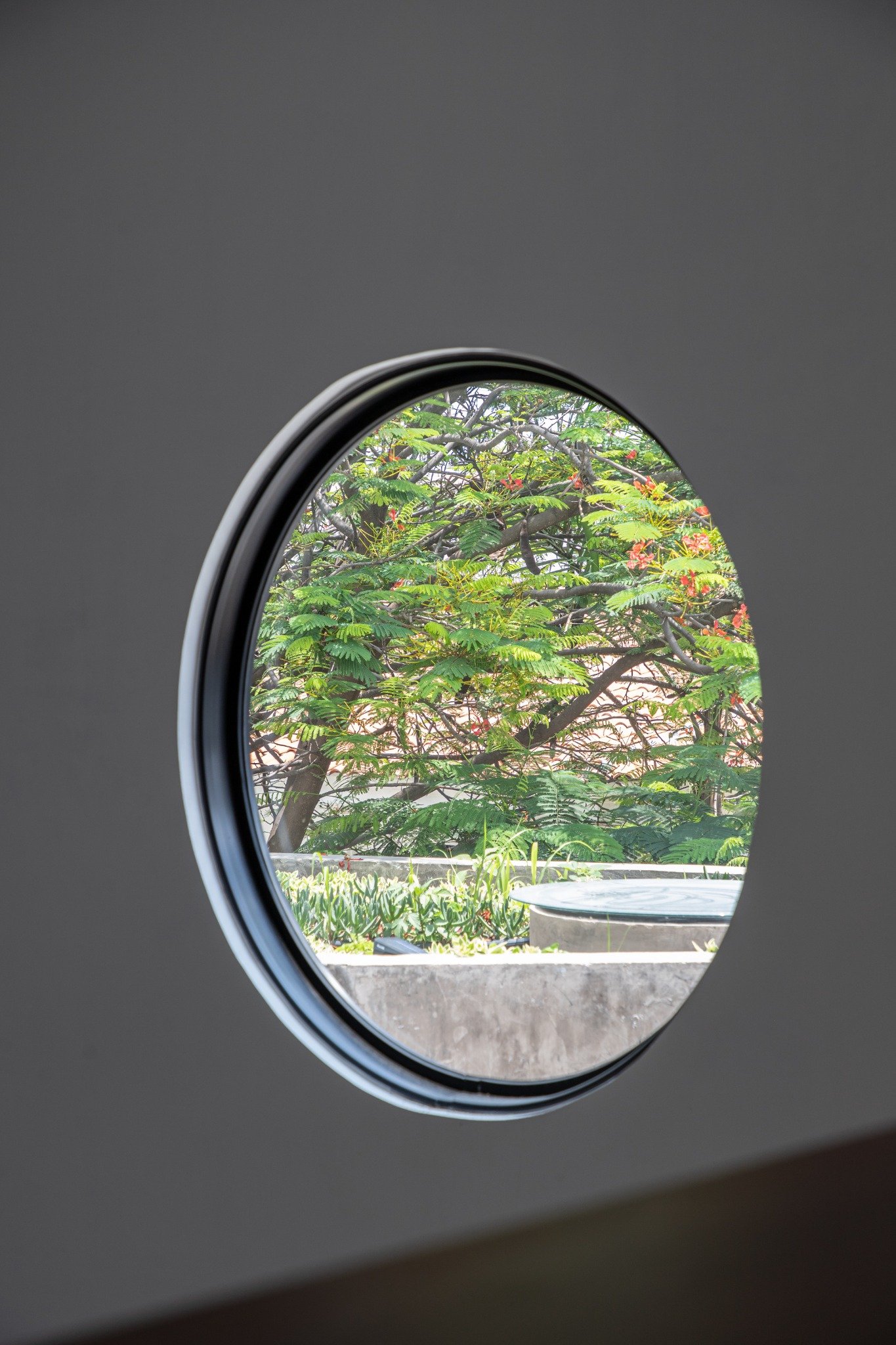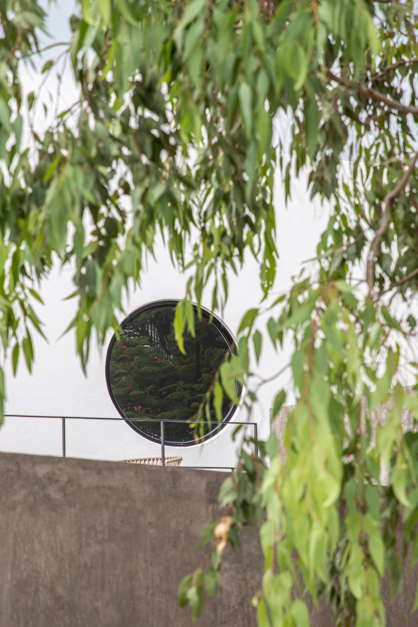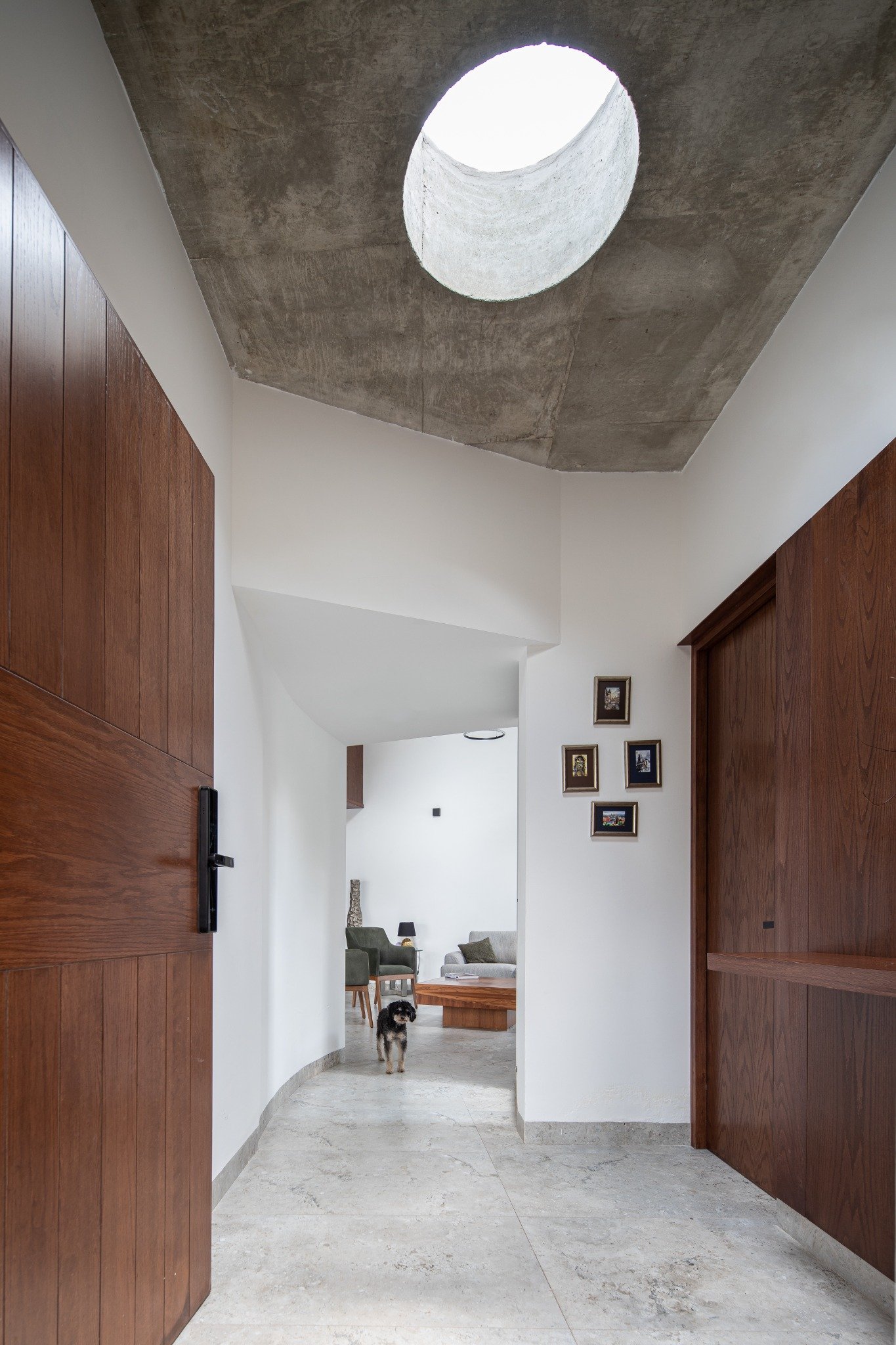 From the outside, the large royal poinciana becomes the first architectural gesture: a threshold tree that guides the entrance. The entrance is through a contemporary vestibule, a roofed space with vertical proportions, where exposed concrete and a circular oculus in the slab create an intermediate atmosphere between interior and exterior, allowing light to highlight the tree's silhouette and invite one to look upwards.