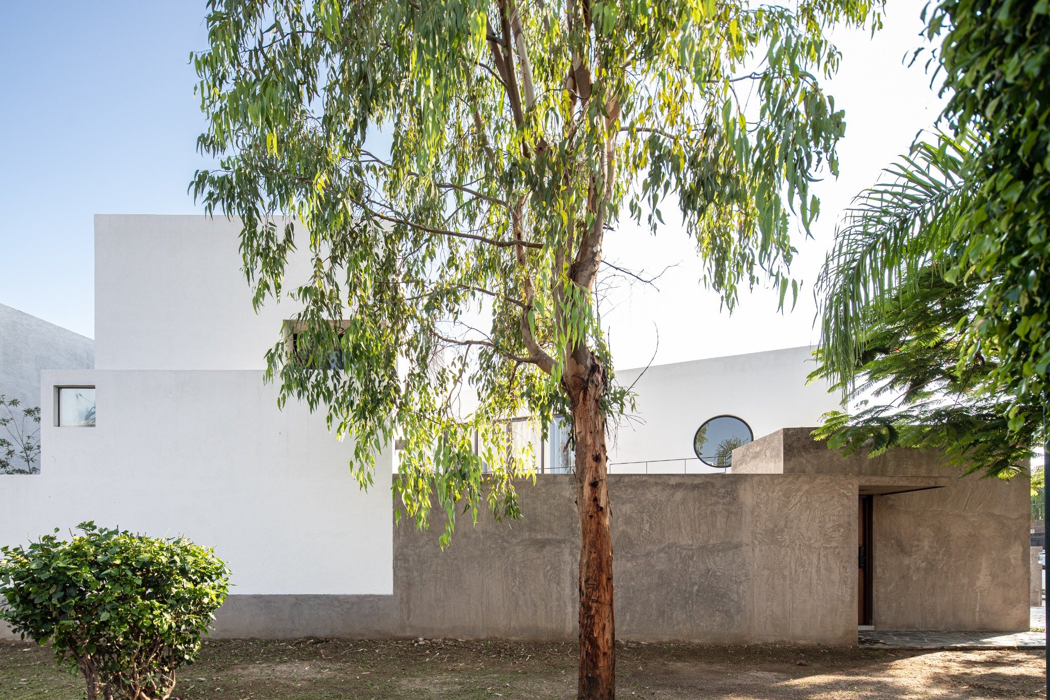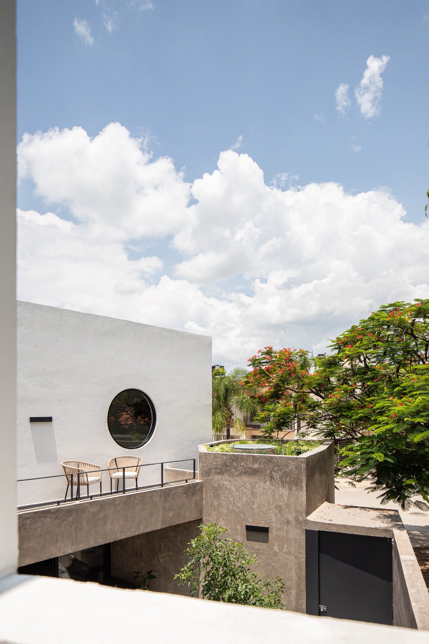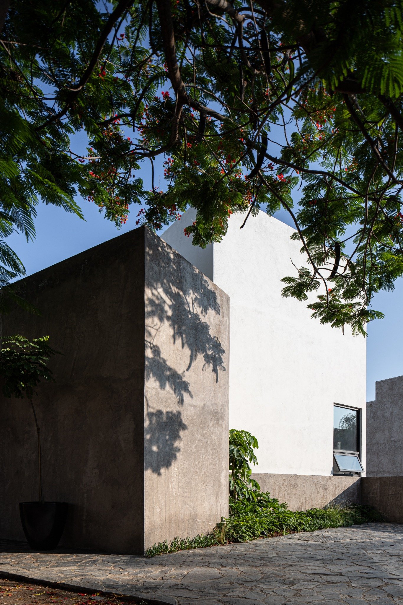 From the outside, the large royal poinciana becomes the first architectural gesture: a threshold tree that guides the entrance. The entrance is through a contemporary vestibule, a roofed space with vertical proportions, where exposed concrete and a circular oculus in the slab create an intermediate atmosphere between interior and exterior, allowing light to highlight the tree's silhouette and invite one to look upwards.