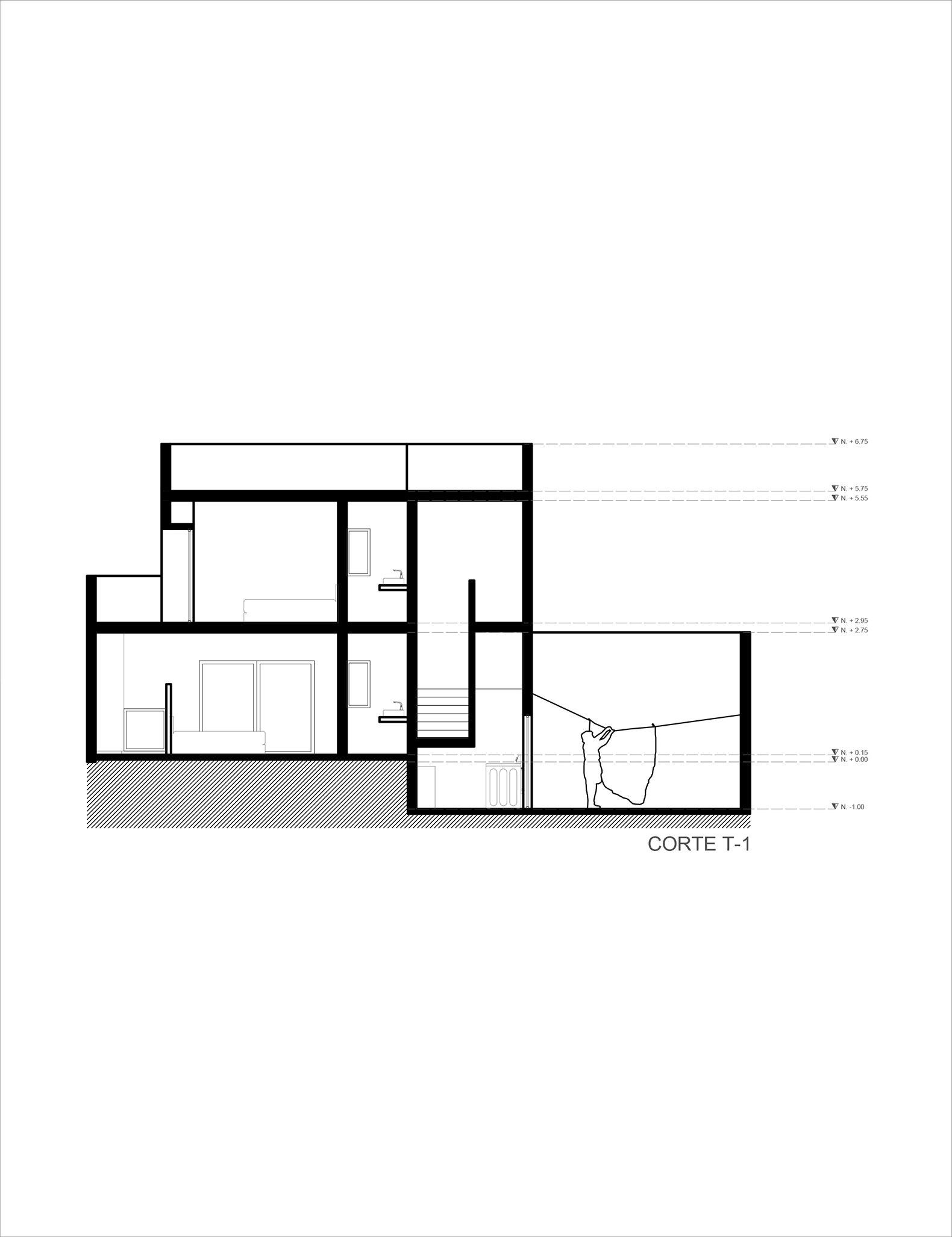 The remaining spaces are organized within a compact, tower-like volume containing the bedrooms. This volume opens and closes according to the orientation and the need for ventilation and privacy. The central courtyard is conceived as a fundamental space that allows for natural ventilation and solar control throughout the day, while also allowing the treetops to become the focal point of the interior.