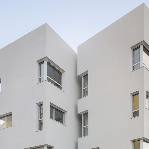 The access to the building converges to its center, this route is accentuated by the proximity and tension between the volumes The program organizes two T0 apartments and fourteen T1 apartments, spread over four floors. A basement floor was dedicated to parking.
