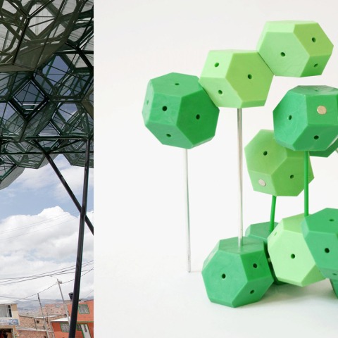 The Bosque de la Esperanza / Forest of Hope is a project made of modules, able to grow and adapt to different situations. Each of the modules is a polyhedron of 12 faces, that is to say, a dodecahedron. The materials used are expanded mesh, round metal tube and translucent tiles