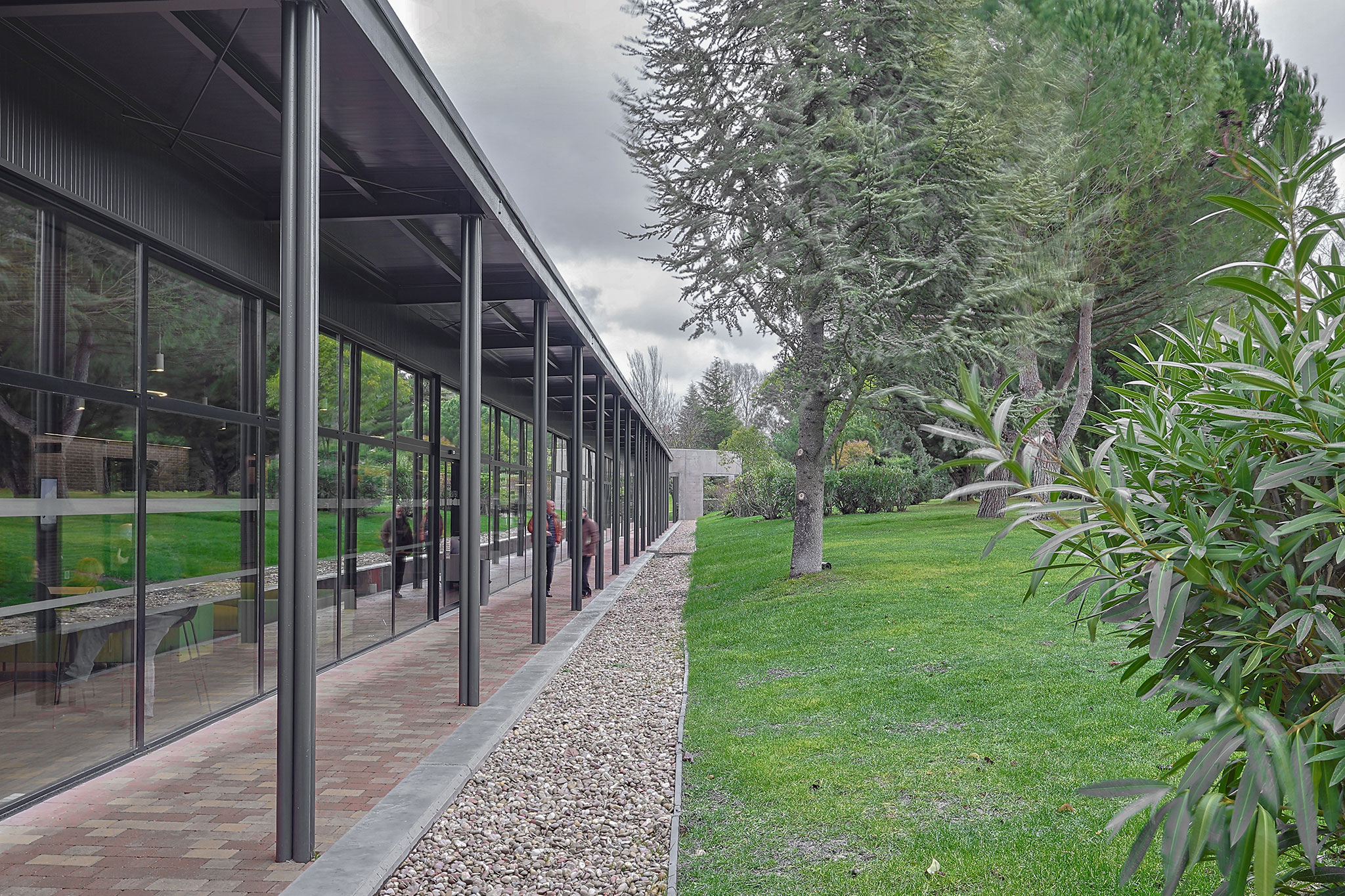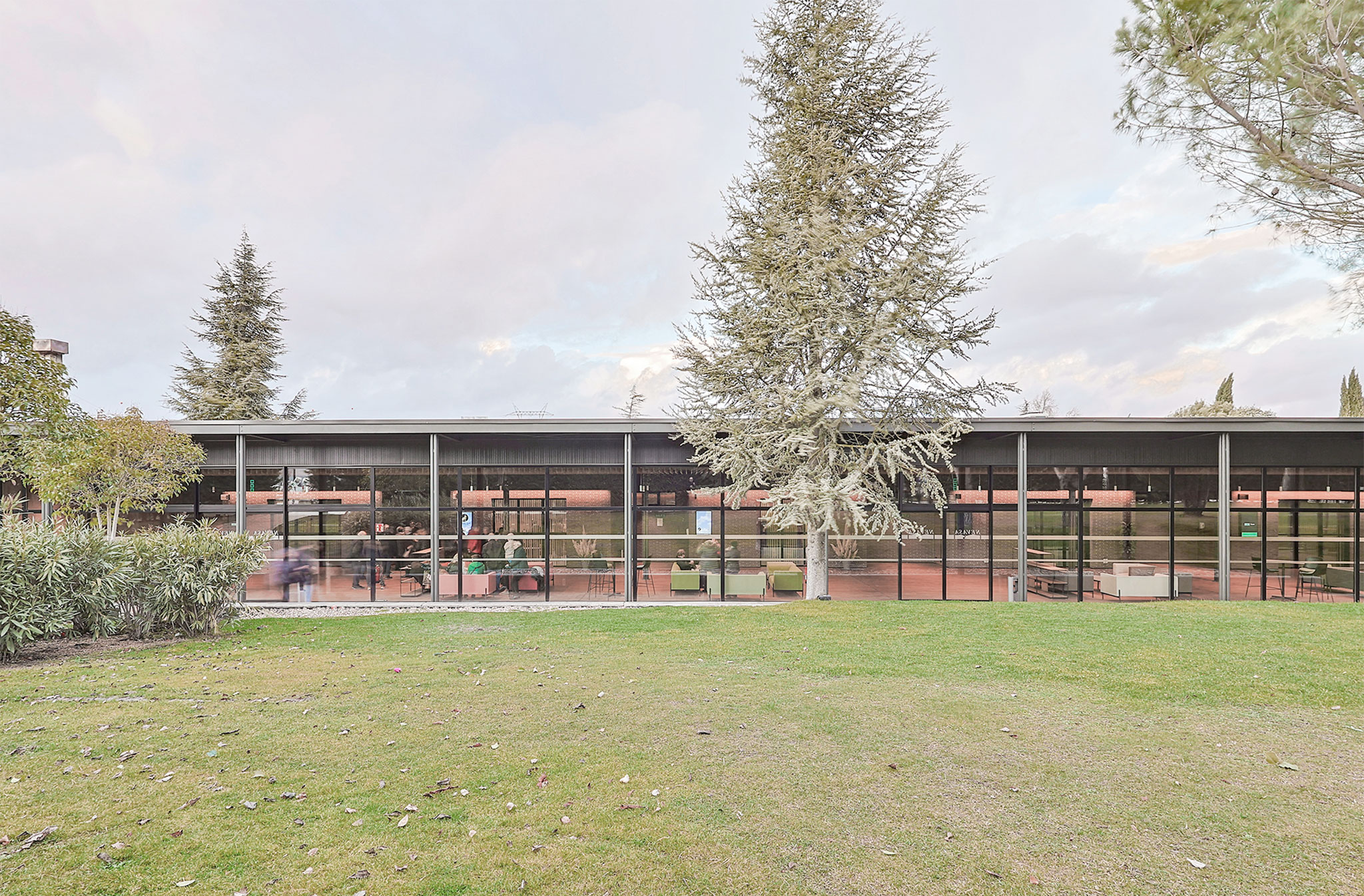 Along the south façade, the project consolidates a transition zone between the building and the garden by means of a longitudinal porch that extends the protected circulation area. This element not only improves climate comfort but also acts as a continuous structure, linking the different sections and reinforcing the relationship of the funeral home with its surrounding landscape. Simultaneously, the staff area undergoes a partial renovation, restructuring spaces and updating facilities. To the east, the roof extends to the cafeteria, which is renovated and expanded, enhancing its role as a complementary service to the complex.