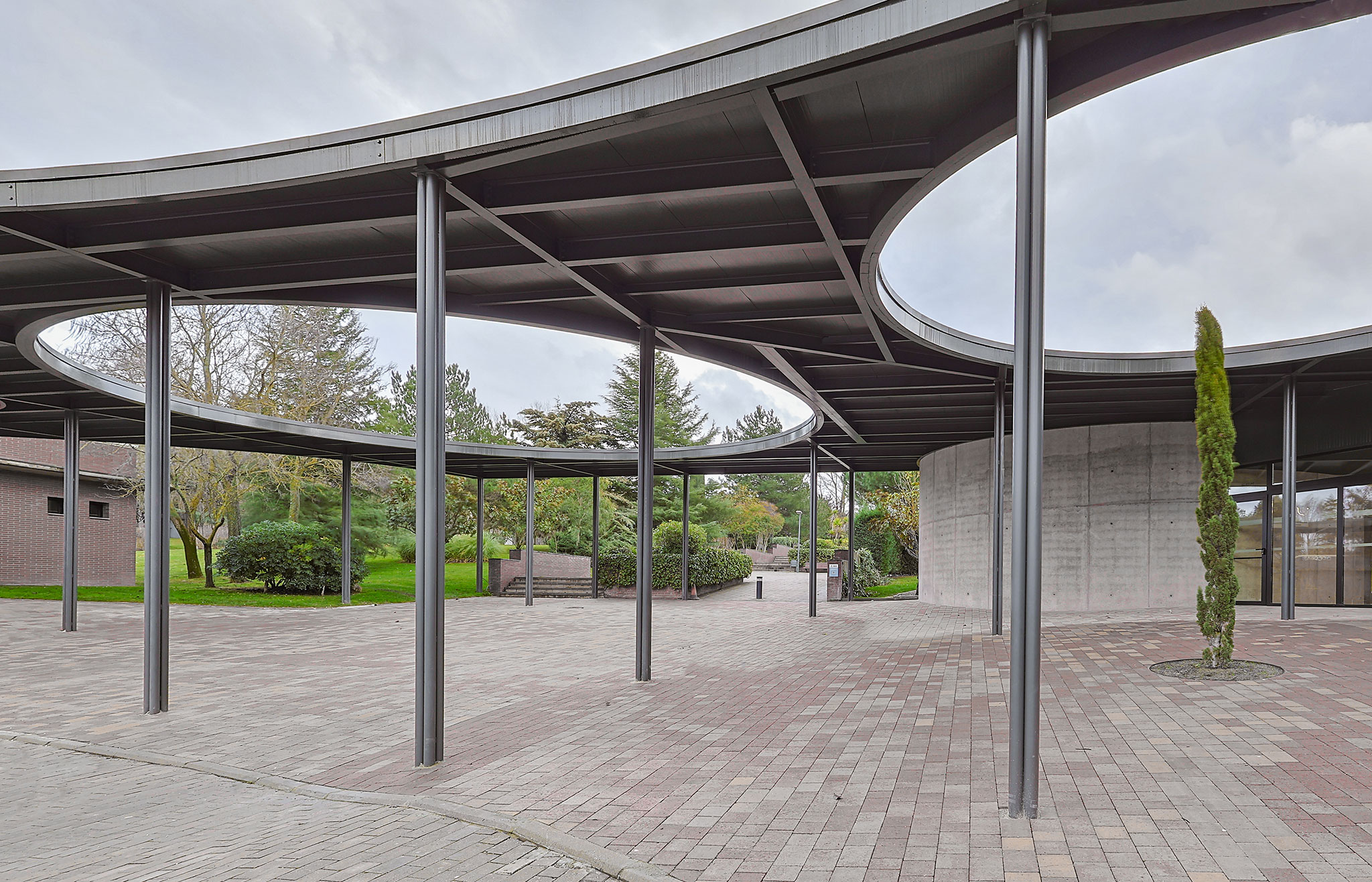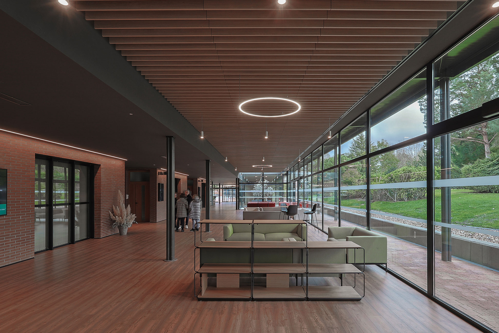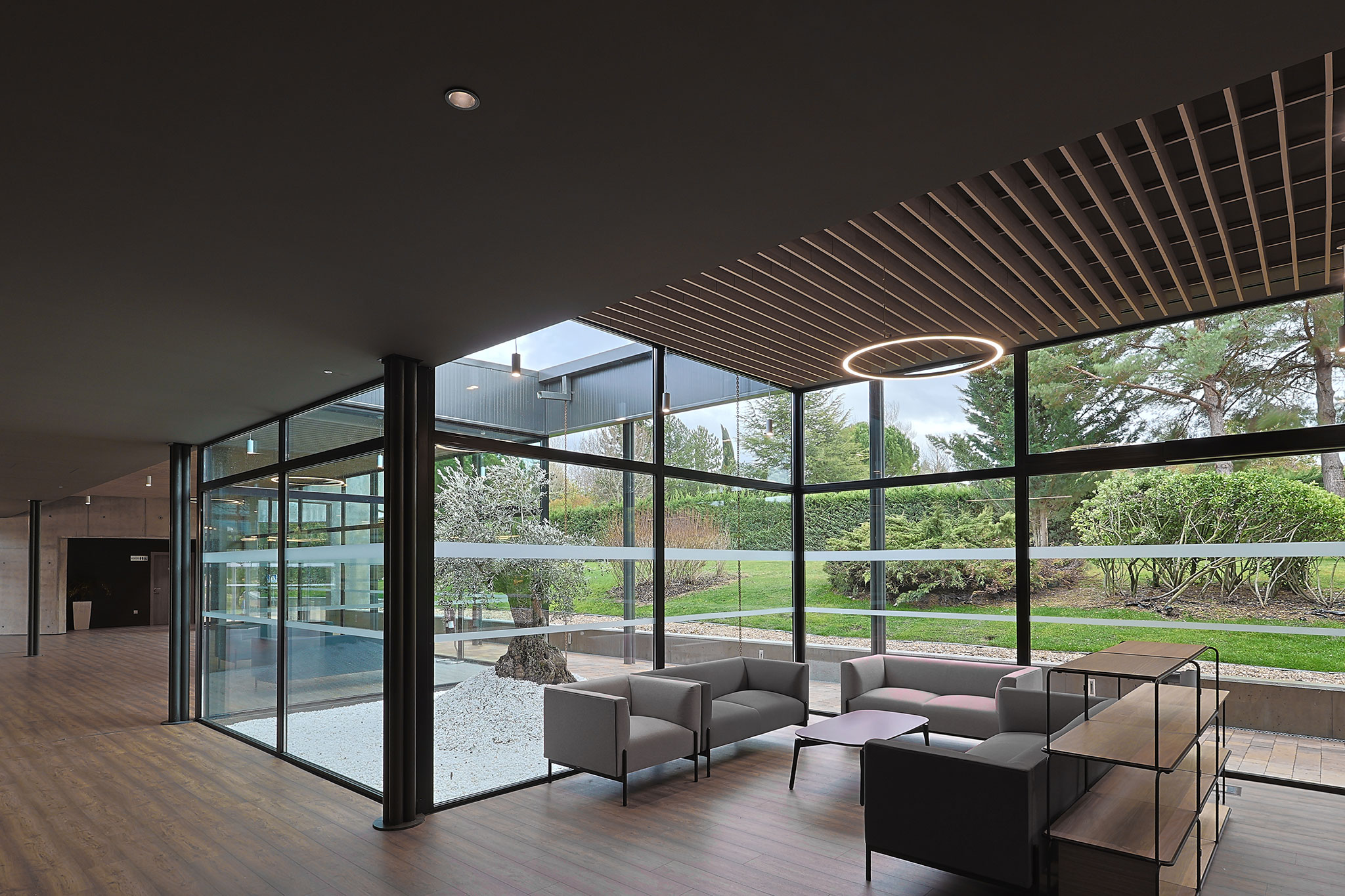 To the west, the roof extends, embracing the funeral home and crematorium, creating a large space in front of the viewing rooms and completing the program with the addition of two new viewing rooms to the existing ones. The renovation also reorganizes the internal circulation between the funeral home and crematorium and integrates an enclosed area for unloading coffins, improving the efficiency and discretion of the services.