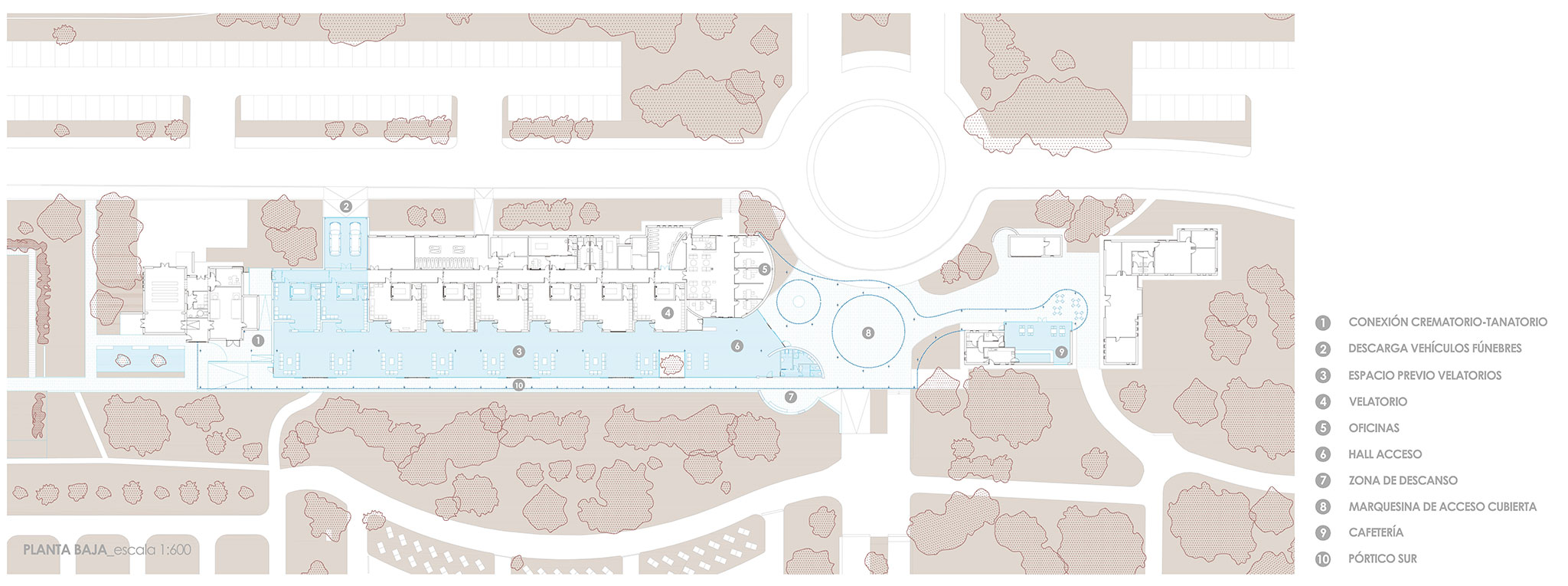The expansion and renovation project by Arias Garrido Arquitectos and GMM Ingeniería y Arquitectura begins the journey to the cemetery with a covered plaza, designed as an anteroom and gathering place. To the west, the project's striking roof extends over the funeral home and crematorium, creating a large space before the viewing rooms and incorporating two new viewing rooms in addition to the existing ones. Along the south façade, the project consolidates a new transitional space between the building and the garden, and to the east, the roof extends to the also renovated cafeteria. Inside, an enclosed area for unloading coffins is integrated.