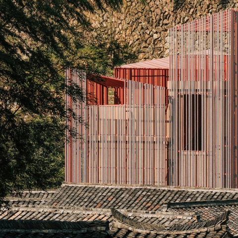 In the early morning, as sunlight begins to filter into the mountain village, light and shadow begin to "weave" across the façade. Thanks to the red-and-white orientation of the aluminum slats, the building takes on subtle and ever-shifting hues throughout the day. This means that each visit to the Z Museum may offer a distinct impression: on bright, sunny afternoons, it may appear as a translucent pink volume; on rainy or snowy days, it becomes a serene, white monolith.