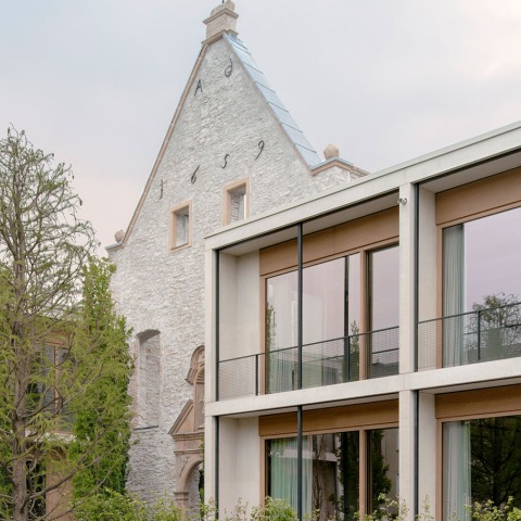The existing ensemble originates from a former seventeenth century Capuchin monastery. The buildings, which were used as a hospital from 1841 onwards, were severely damaged during the Second World War. Subsequently, the complex underwent several changes and extensions through reconstruction and later modifications. The conversion for the Jacoby Studios involved the removal of the post-war additions, exposing the historic building fabric of the monastery once again. In particular, the chapel façade, the cloister, the east building wing and the seventeenth century cellar were preserved and restored, creating a picturesque ruin structure made of quarry-stone masonry with the former cloister at its heart. The complex of monastery and annexes is embedded into a garden designed by Wirtz International.