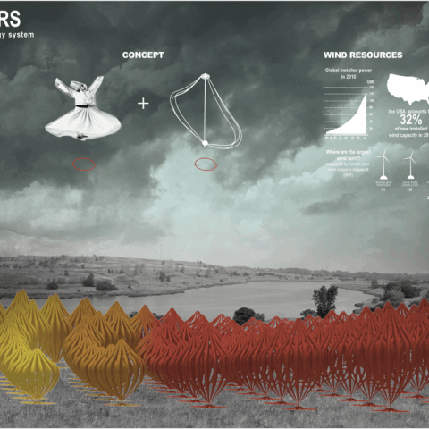 The Whirlers are 10.000 vertical Turbines designed according to a flexible geometric grid. The grid responds to the site topography, dominant winds and programmatic conditions. The design process was conceived by translating in a set of numerical data the project input. Thisprocess permits to transform the site condition in editable data.
