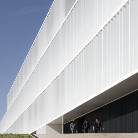 The white facades are configured as an abstract skin, which on the main elevation, thanks to a grid of slats, functions as an element of solar control. The west facade is projected as a continuous perforated white plane that avoids direct radiation in the late afternoon hours.