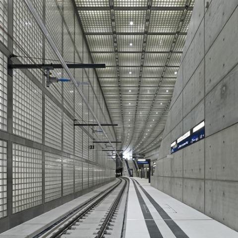 The station concourse’s supporting structure of precast reinforced concrete is not visible behind the glass block cladding. The wall elements of the glass block envelope are anchored to a steel substructure on the tunnel wall. The ceiling elements are suspended from the building shell.