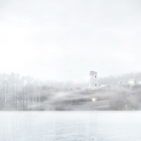 The proposed building is high enough so the two lakes can be observed. As the site is occupied by a consistent number of trees the building is placed in such a way it vanishes in the middle of the wooden landscape, resembling almost a large rock in the middle of a forest. The essence for the interior spaces, as well as the final form of the building, are a consequence of these sensations that interior and exterior share.