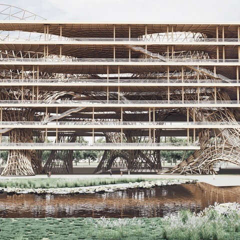 Talent Machine is a symbolic expression where the word machine brings to mind a system, one that stays in action, in a movement. Talent is a general expression often meaning an abstract concept of a skill, knowledge, or information. Talent Machine is a new kind of innovation campus where ideas are born - a platform where skills, knowledge, and information can be exchanged. The goal of the Talent Machine is to bring not only an intangible intellectual inspiration but also a completely substantial architectural form - a building or rather a set of buildings that are given a specific program to play their roles well. The 33-level tall timber structure marks the beginning of a new era, inspiring future entrepreneurs with its fresh feel. It creates an inspirational work environment where ideas are born.