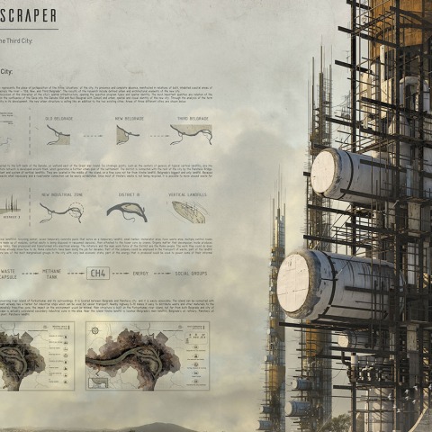 The FIRST PLACE was awarded to METHANESCRAPER designed by Marko Dragicevic from Serbia. The project is a vertical city-district in Belgrade that serves as landfill with recycling capabilities.