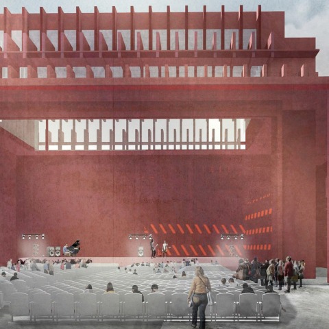 The building moment of maximum splendor is when the auditorium unfolds to the patio, to perform traditional outdoor activities in a space both monumental and informally festive.