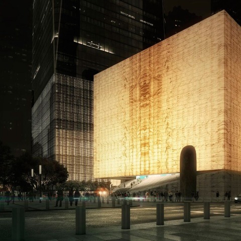 Amidst gleaming glass towers on the north side of the 9/11 Memorial, The Perelman Center is a pure form, rotated and elevated to accommodate complex below - grade constraints, address the 9/11 Museum and transportation hub, and engage the site’s main pedestrian streets of Greenwich and Fulton. The edifice is w rapped in translucent, veined marble — from the same Vermont quarry as the U.S. Supreme Court building and the Thomas Jefferson Memorial — laminated within insulated glass. By day, the volume is an elegant, book - matched stone edifice, whose simplicity and traditional material acknowledge the solemnity of its context. Daylight illuminates the interior through the marble façade. By night, this monolith dematerializes: silhouettes of human movement and theatrical configurations animate the glowing enclosure, an invitingly subtle revelation of the creative energy in side.
