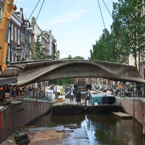 The bridge reached a major milestone with the 3D robotically printed span of the bridge (printing of the bridge began in March 2017, taking approximately six months), completed and revealed to the public in 2018. It is formed of one main pieces and four “corner swirls” that were manually welded together. It will have a double function, on the one hand being a necessary infrastructure, and also being an artistic work that shows the potential of 3D printing technology.