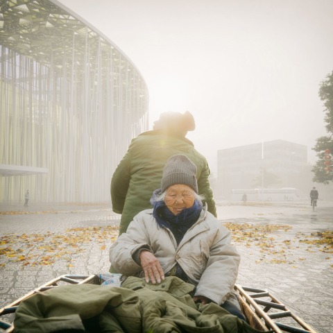 At night, the building envelop is illuminated from below, becoming an ethereal beacon, glimpsed between the forest of ‘bamboo’ columns, drawing spectators and audience in from across the lake and surrounding development.