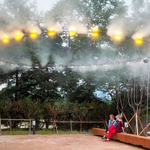 A three-dimensional water vapor canopy; Yellow Dust is a sensing and sensuous infrastructure that monitors, makes visible and partially remediates particulate matter in the air through variable clouds of yellow mist.