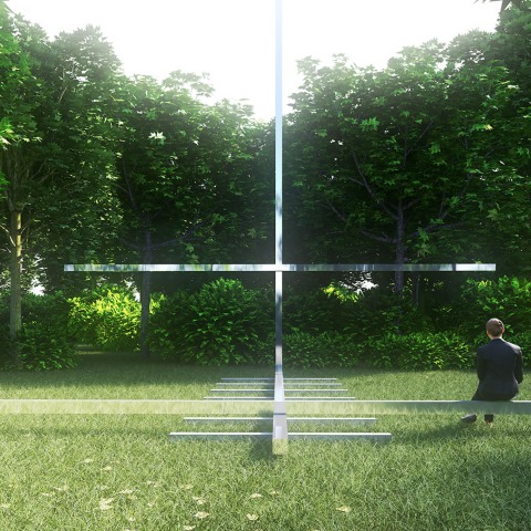 Structurally, they are four beams of square section of 12 by 12 centimeters and with 8 meters of length, that form the set: a cross in foot, and a cross placed in the ground. One is a bank, the other the Cross: two important elements of the Catholic churches represented by the architect. The beams are made of polished stainless steel, transforming them into mirrors that reflect the surroundings: the Chapel can disappear at a certain moment depending on the reflections of the sun and the trees.