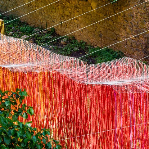 Para contrastar con la gama cromática del lugar se pinta un gran volumen de cañizos de mimbre pelados en la gama de colores amarillos, naranjas, rojo y morado, generando un degradado de colores en el paisaje. Gracias a diferentes ritmos, alturas y densidades, la volumetría variará en el recorrido. Las cañas se encontrarán colgando y quedarán levemente separadas del suelo, dando la sensación que la instalación se eleva sobre el río y traspasa los recorridos convencionales.