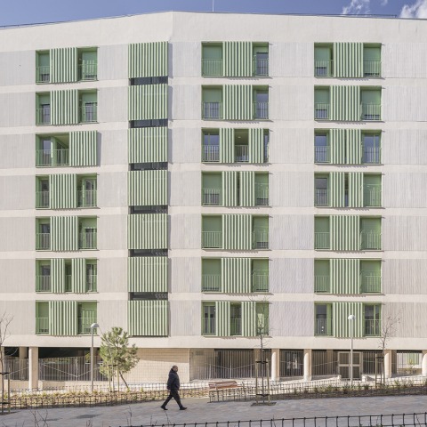 La concatenación de espacios exteriores de relación, tanto en planta baja, intermedias y de ático, con los espacios interiores de encuentro, en los ensanchamientos de las galerías interiores y en los grandes espacios de planta baja generan un buen balance de espacios comunes y privados. Las viviendas cumplen con las superficies útiles establecidas por EMVS Madrid, y se han maximizado y ajustado los espacios de relación, intentando evitar los espacios de mera comunicación. Dos bloques se pliegan ligeramente evitando la monotonía y la rotundidad de volúmenes tan grandes como los que plantea el plan urbanístico, sin renegar de la deseada compacidad.