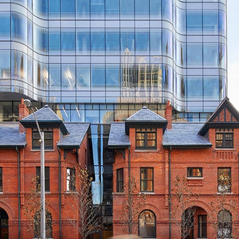 El podio se pliega e incorpora los edificios patrimoniales, equilibrando elegantemente las proporciones y utilizando vidrio y piedra para contrastar y realzar las fachadas existentes. La torre está envuelta en un ondulado velo de vidrio. Al retroceder desde la base victoriana, la torre parece flotar.