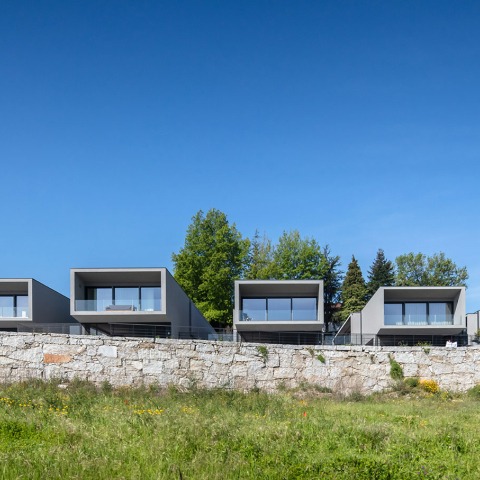 Todas las casas tienen una planta similar, con el garaje, la entrada y el área de almacenamiento en el nivel inferior, y los espacios devivienda en el superior. El exterior busca un contrapunto con el entorno natural con líneas limpias y un revestimiento gris liso.