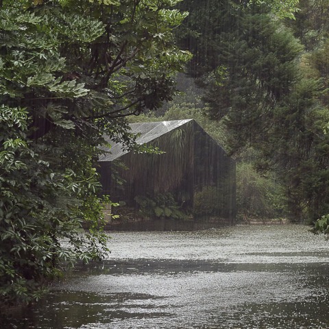 Se implanta en la parte superior del lago, cuya agua ofrece su principio: vidrio oscuro que refleja su reflejo y también el paisaje circundante de denso follaje. El pabellón está lleno de color, luz y ecos, "camuflándose" en su entorno de host.