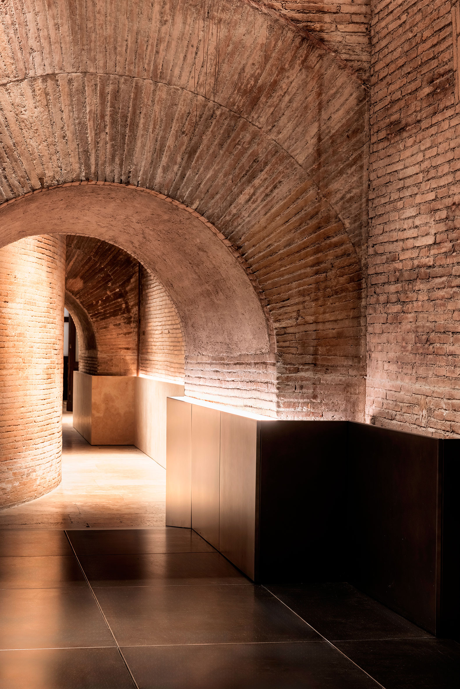 La intervención emplea elementos arquitectónicos contemporáneos individuales, diseñados para hacer legible y perceptible el espacio antiguo para el visitante mediante el contraste de materiales (lo antiguo: ladrillo, frente a lo contemporáneo: metal).