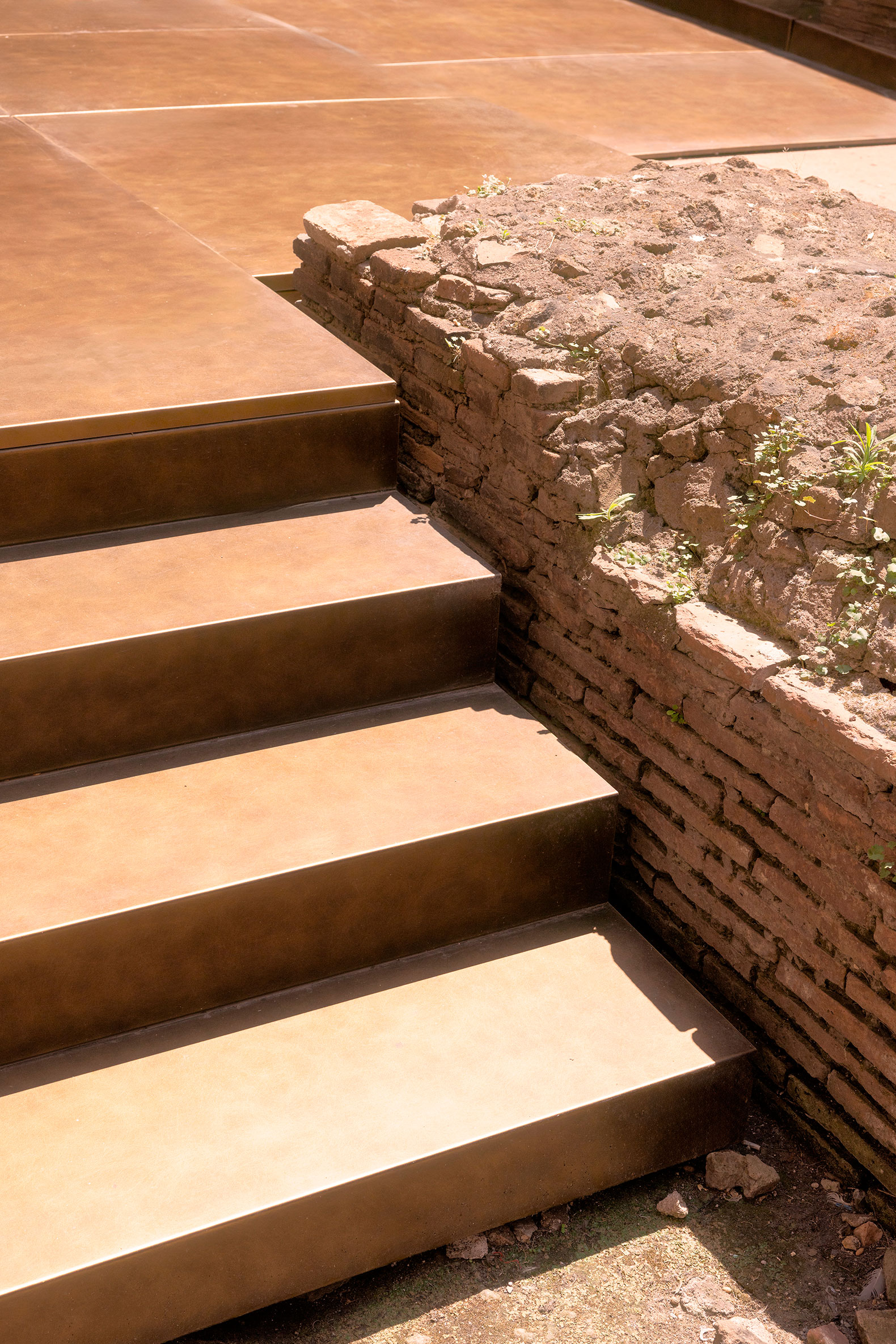 Donde el espacio histórico se estrecha o se expande siguiendo las curvas de ladrillo del Panteón y las ruinas del ábside de la Basílica de Neptuno, el recorrido se despliega horizontal y verticalmente a lo largo, por encima y dentro de los paneles metálicos utilizados para su acabado. Mediante un tratamiento superficial intencionadamente no uniforme, estos paneles dialogan con la pátina del tiempo que marca el Monumento. El proyecto establece así un diálogo entre el polvo de las superficies de ladrillo originales y la materialidad de las láminas metálicas, a través de las técnicas de galvanización, los procesos de laminado y recubrimiento, donde se emplean negros de calamina, azules de laminación y oxidaciones de aleación según las enseñanzas del Arte Povera romano, para crear un diálogo cotidiano con la historia.