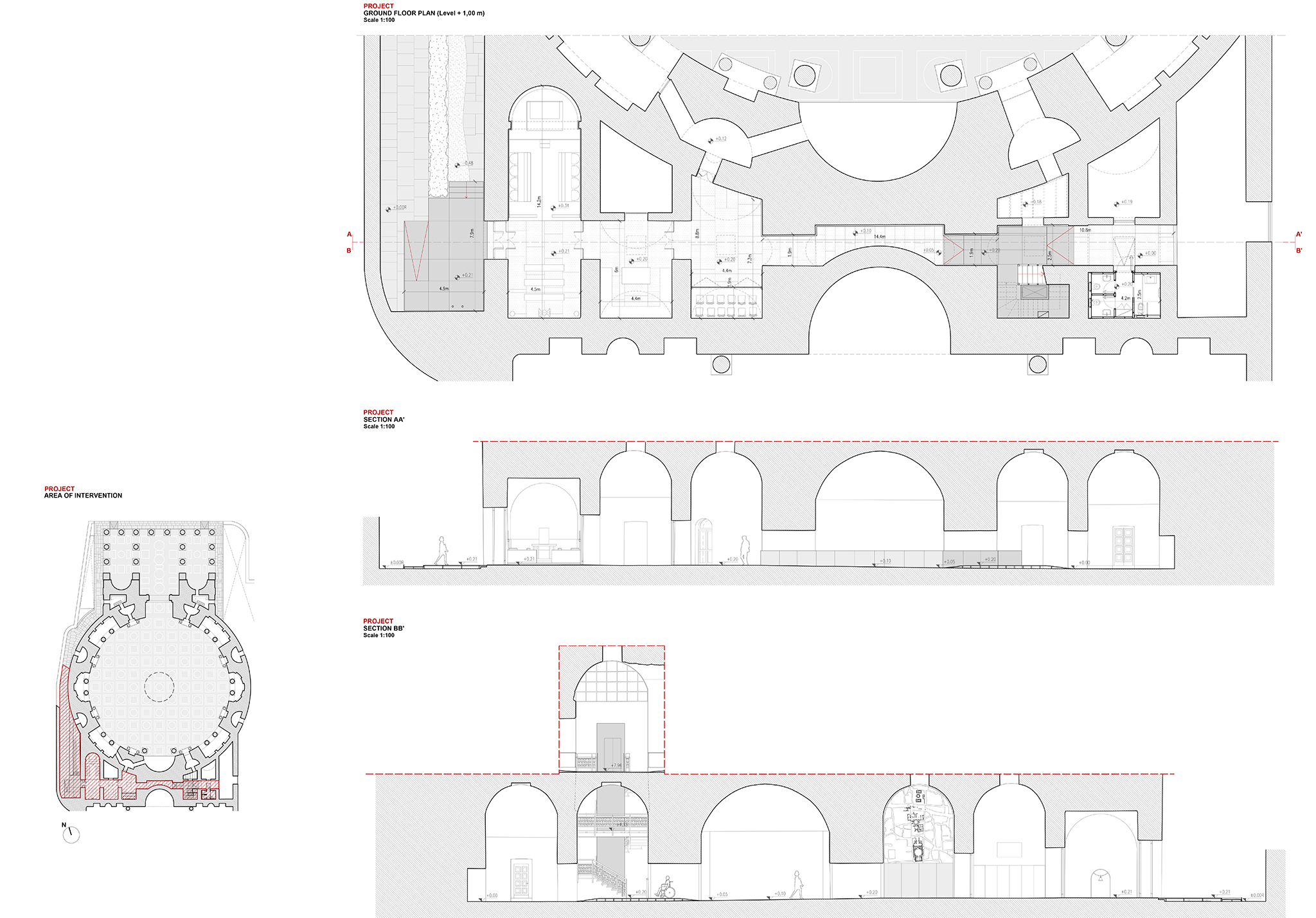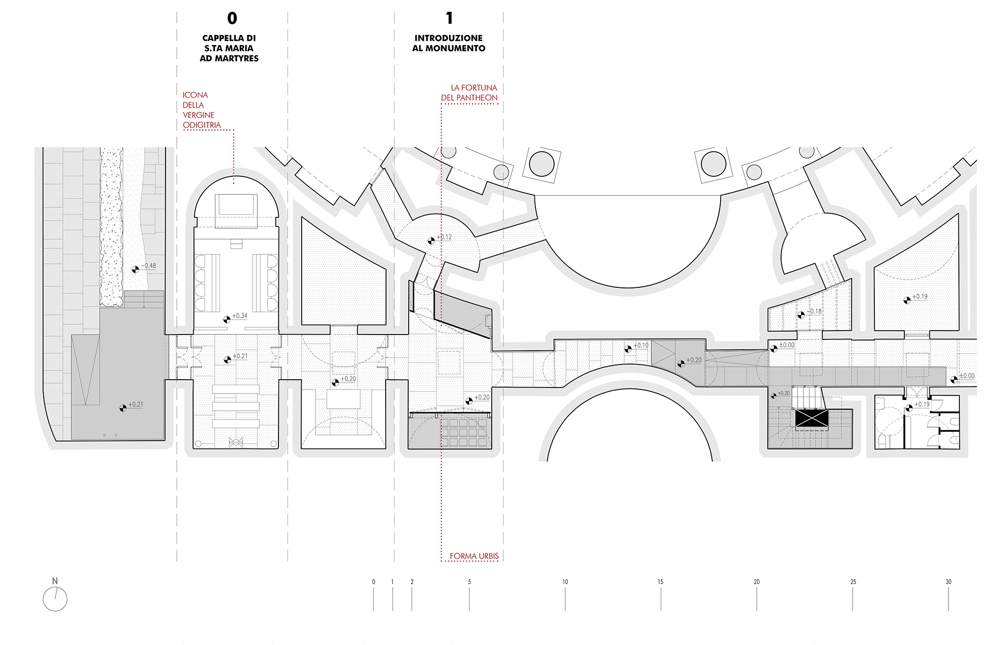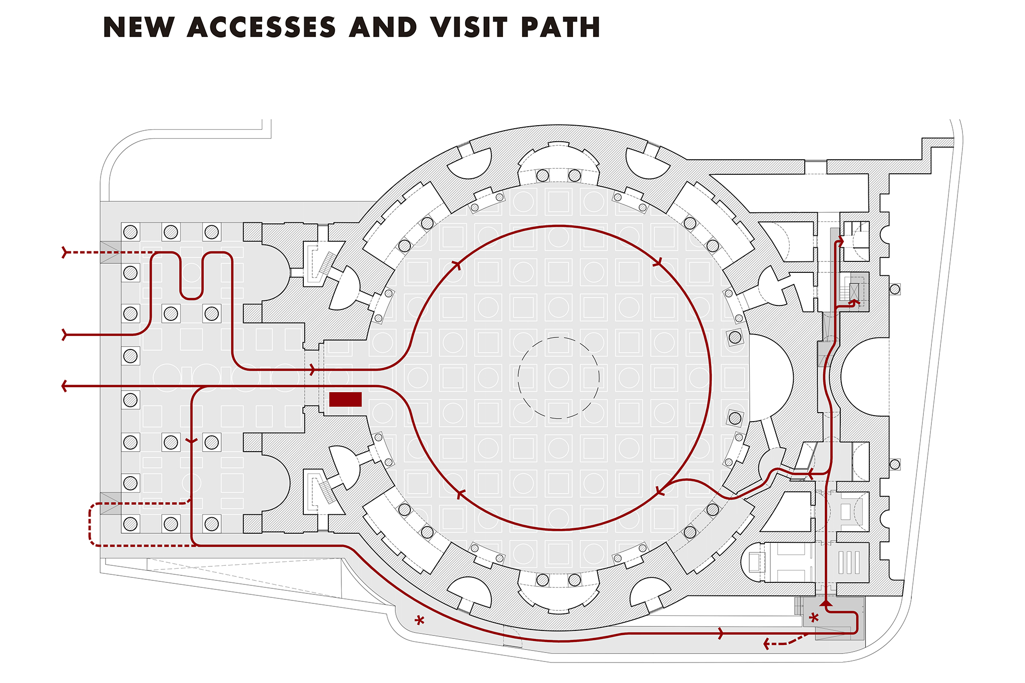 El proyecto permite la apertura de estos espacios al público bajo los principios de inclusión social y accesibilidad universal. La intervención permite a los visitantes acceder a ambas plantas, que, debido a la excepcional naturaleza de los materiales recogidos y expuestos, constituyen un auténtico museo del propio Monumento. El proyecto opera mediante la sustracción, buscando enfatizar la espacialidad romana comprimida entre el cilindro perimetral de la Rotonda y el del ábside de la Basílica de Neptuno, aún perceptible como ruina desde la Via della Palombella.