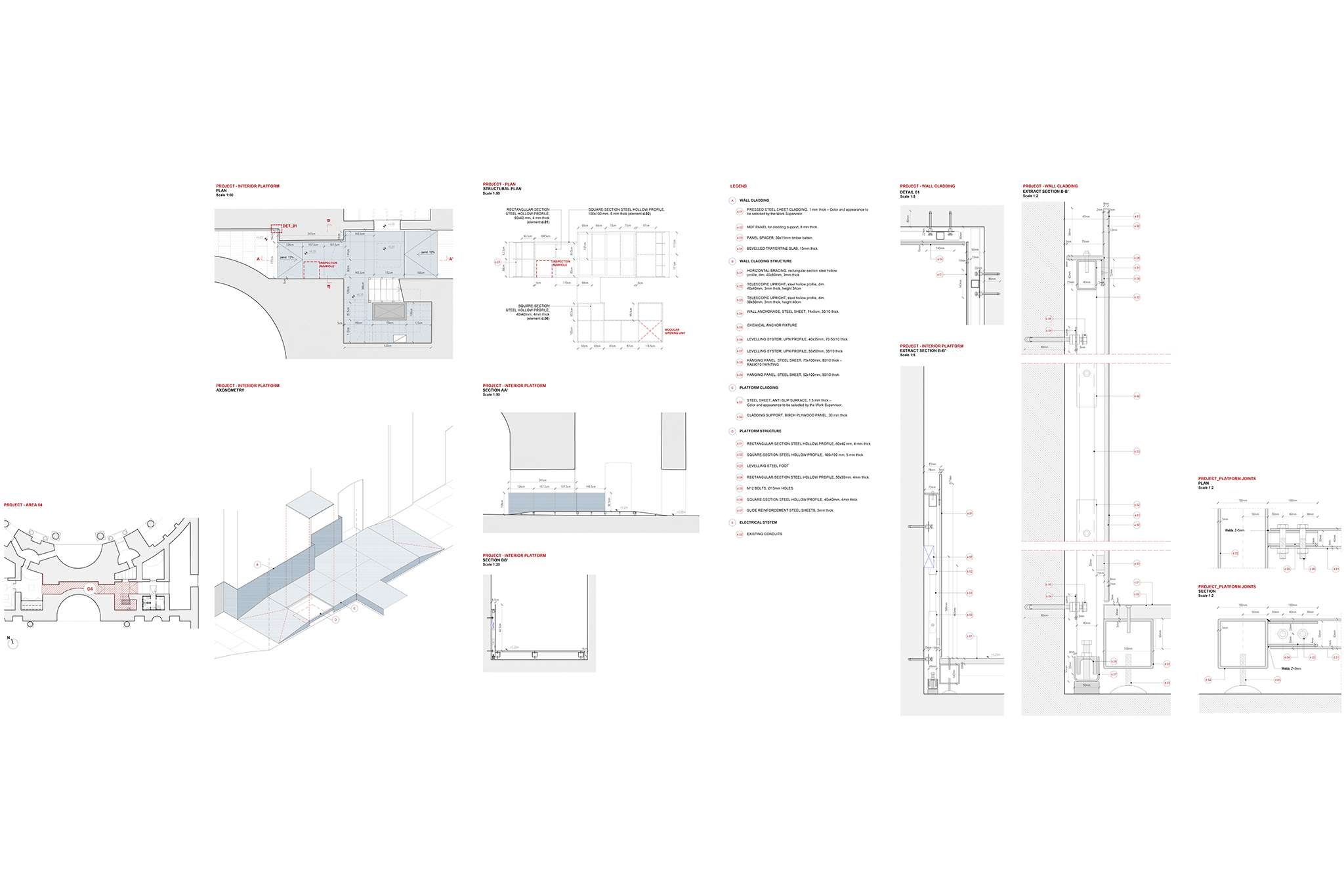 Como en una secuencia cinematográfica, los visitantes recorren distintos espacios cuyas funciones se destacan mediante elementos arquitectónicos específicos integrados en el tejido arqueológico. Estos dispositivos responden a requisitos técnicos y, a la vez, funcionan como instalaciones autónomas dentro del recorrido: microarquitecturas que interactúan con el espacio arqueológico, enfatizando sus huellas históricas. Una antigua plataforma de color bronce dialoga con la histórica puerta revestida de cobre; el icono bizantino de la Hodegetria con fondo dorado parece flotar sobre el coro restaurado de madera oscura; el paso hacia la Rotonda está mediado por el filtro semitransparente de una estructura de almacenamiento sobre la que se imprime la célebre forma urbis de Rodolfo Lanciani. Este último espacio se define por una barandilla metálica que dirige el camino y se fusiona con las láminas metálicas del ascensor; el ascensor se eleva como un elemento monolítico en la planta superior. Aquí, la unión entre el monolito y el suelo original se produce mediante una separación acristalada que permite a los visitantes percibir la distancia —literal y temporal— entre la nueva intervención y la preexistencia histórica.