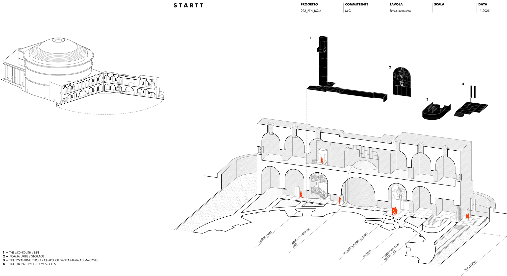 La intervención de micro-arquitecturas proyectada por STARTT permite a los visitantes acceder a las dos plantas que conforman el proyecto, introduciendo un nuevo sistema de rampas y un nuevo ascensor en el yacimiento arqueológico para garantizar el acceso completo a la planta superior. Los espacios expositivos albergan la capilla de la Basílica de Santa María ad Martyres, junto con fragmentos arquitectónicos que representan las diversas fases históricas del Panteón y la Basílica de Neptuno.