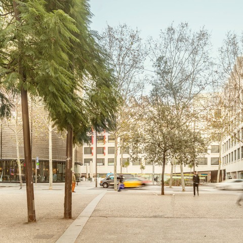 Cualificación del espacio: Favorecer el incremento de usos y el confort ambiental. Deshacer barreras físicas, poner pavimentos blandos, añadir sombra, modificar el mobiliario para generar espacios de estar y encuentro, dotar de identidad y confort la plaza Vázquez Montalbán.