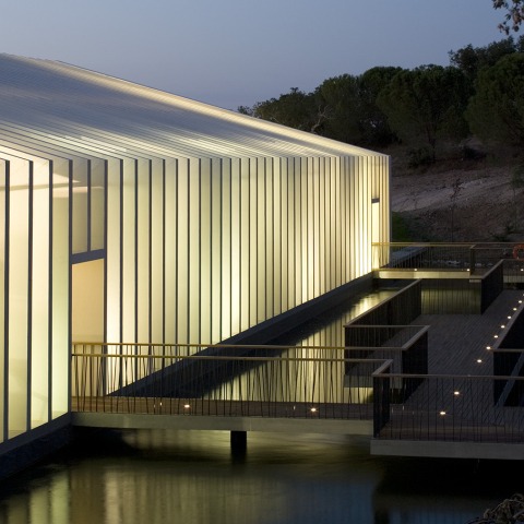 El Acuario Fluvial se ubica en Mora, un pequeño municipio al norte de la región de Alentejo. Dada la necesidad de cambiar el desarrollo regional de la dependencia de una economía agrícola cada vez más débil, dentro del turismo ambiental y el mercado libre, el municipio puso en marcha un concurso de diseño y construcción de un acuario que de alguna manera pudiera encarnar los paradigmas de la biodiversidad del río ibérico. Integrado en el Parque Ecológico de Gameiro Wild y bordeando el arroyo Raia, el edificio se encuentra en medio de un campo aislado de corcho y olivos retirado de las actividades de tiempo libre y la pesca más intensa del río. La parcela tiene una topografía suavemente ondulada formando una cuenca en la confluencia de dos pequeños cursos de agua. Situar el acuario en el borde de este lago de retención casi natural reunió la relación fundamental entre sus contenidos temáticos y la presencia de agua dulce.